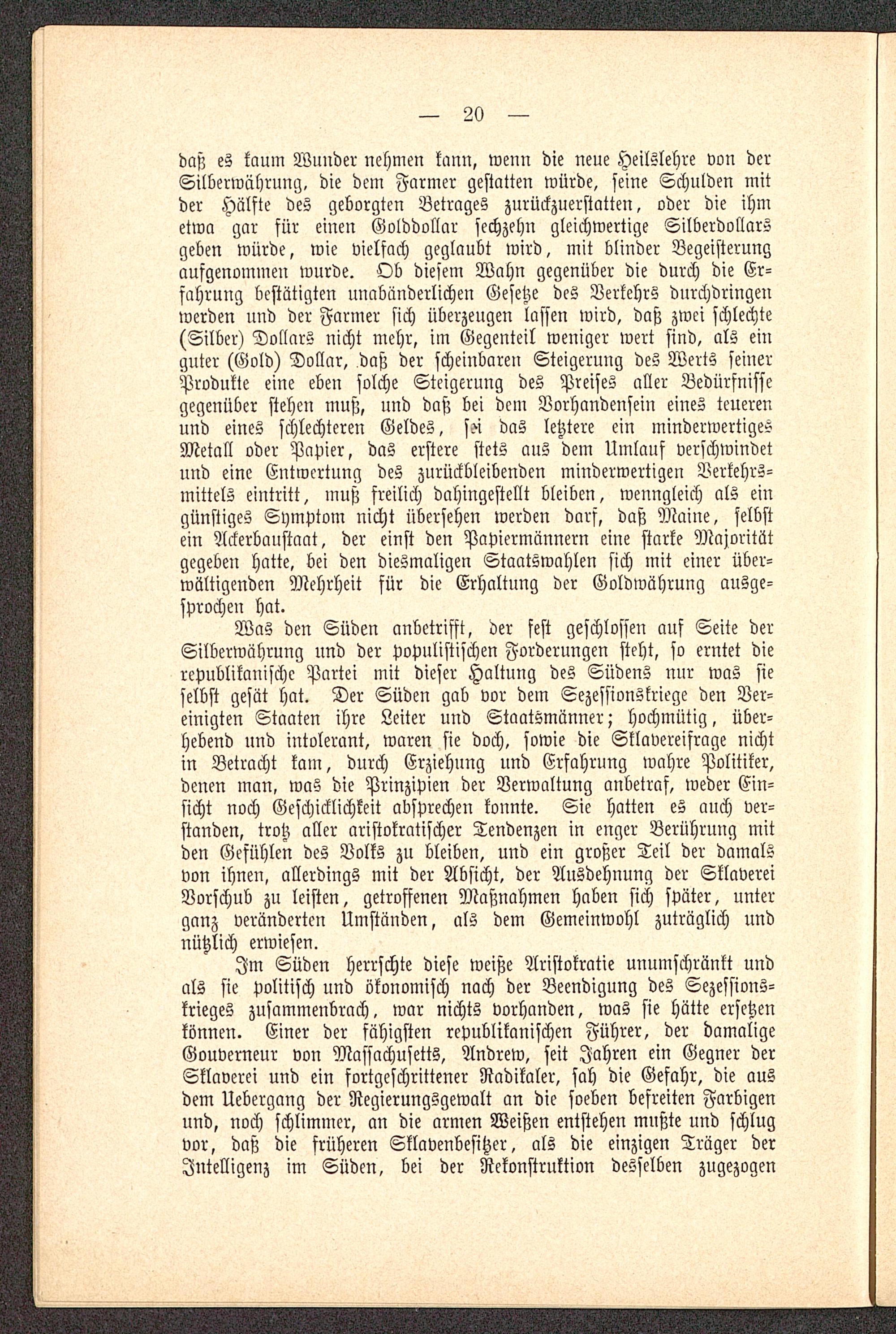 Was den Süden anbetrifft, der fest geschlossen ans Seite derSilberwährung und der populistischen Forderungen steht, so erntet dierepublikanische Partei mit dieser Haltung des Südens nur was sieselbst gesät hat. Der Süden gab vor dem Sezessionskriege den Ver-einigten Staaten ihre Leiter und Staatsmänner; hochmütig, über-hebend und intolerant, waren sie doch, sowie die Sklavereifrage nichtin Betracht kam, durch Erziehung und Erfahrung wahre Politiker,denen mau, was die Prinzipien der Verwaltung anbetraf, weder Ein-sicht noch Geschicklichkeit absprechen konnte. Sie hatten es auch ver-standen, trotz aller aristokratischer Tendenzen in enger Berührung mitden Gefühlen des Volks zn bleiben, und ein großer Teil der damalsvon ihnen, allerdings mit der Absicht, der Ausdehnung der SklavereiVorschub zu leisten, getroffenen Maßnahmen haben sich später, unterganz veränderten Umständen, als dem Gemeinwohl zuträglich undnützlich erwiesen.