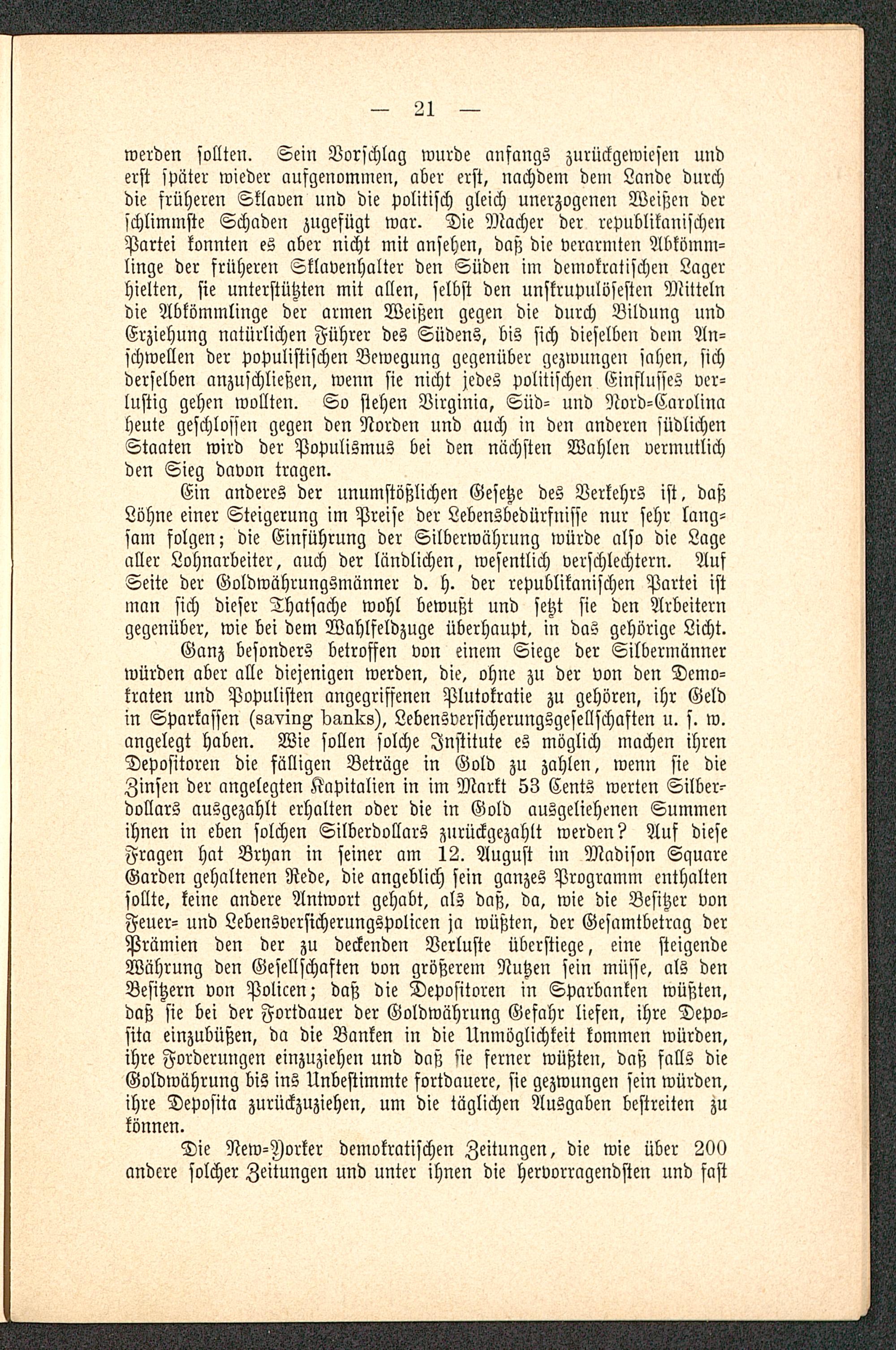 Ganz besonders betroffen von einem Siege der Silbermännerwürden aber alle diejenigen werden, die, ohne zu der von den Demo-kraten und Populisten angegriffenen Plutokratie zu gehören, ihr Geldin Sparkassen (savinZ daulcs), Lebensversicherungsgesellschaften u. s. w.angelegt haben. Wie sollen solche Institute es möglich machen ihrenDepositoren die fälligen Betrüge in Gold zn zahlen, wenn sie dieZinsen der angelegten Kapitalien in im Markt 53 Cents werten Silber-dollars ausgezahlt erhalten oder die in Gold ausgeliehenen Summenihnen in eben solchen Silberdollars zurückgezahlt werden? Auf dieseFragen hat Bryan in seiner am 12. August im Madison SquareGarden gehaltenen Rede, die angeblich sein ganzes Programm enthaltenfollte, keine andere Antwort gehabt, als daß, da, wie die Besitzer vonFeuer- und Lebensversicherungspolicen ja wüßten, der Gesamtbetrag derPrämien den der zu deckenden Verluste überstiege, eine steigendeWährung den Gesellschaften von größerem Nutzen sein müsse, als denBesitzern von Policen; daß die Depositoren in Sparbanken wüßten,daß sie bei der Fortdauer der Goldwährung Gefahr liefen, ihre Depo-sit« einzubüßen, da die Banken in die Unmöglichkeit kommen würden,ihre Forderungen einzuziehen und daß sie ferner wüßten, daß falls dieGoldwährung bis ins Unbestimmte fortdauere, sie gezwungen sein würden,ihre Deposit« zurückzuziehen, um die täglichen Ausgaben bestreiten zukönnen.