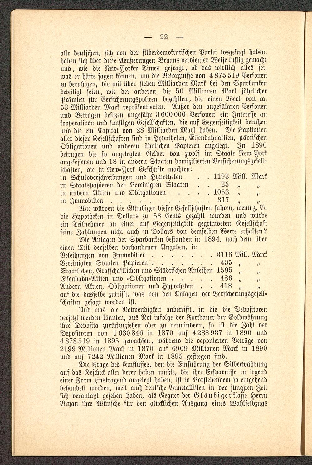 Und was die Notwendigkeit anbetrifft, in die die Depositorenversetzt werden könnten, aus Not infolge der Fortdauer der Goldwährungihre Deposita zurückzuziehen oder zu vermindern, so ist die Zahl derDepositoren von 1 630 846 in 1870 auf 4288 937 in 1890 und4 878 519 in 1895 gewachsen, während die deponierten Beträge von2199 Millionen Mark in 1870 auf 6909 Millionen Mark in 1890und auf 7242 Millionen Mark in 1895 gestiegen sind.
