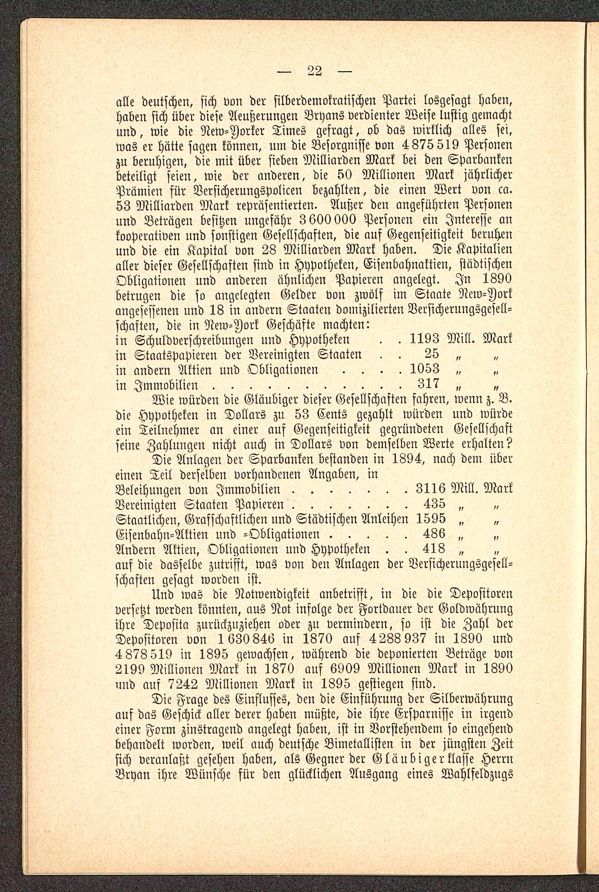 alle deutschen, sich von der silberdemokratischen Partei losgesagt haben,haben sich über diese Aeußerungen Brycms verdienter Weise lustig gemachtund, wie die New-Iorker Times gefragt, ob das wirklich alles sei,was er Hütte sagen können, um die Besorgnisse von 4875 519 Personenzu beruhigen, die mit über sieben Milliarden Mark bei den Sparbankenbeteiligt seien, wie der anderen, die 50 Millionen Mark jährlicherPrämien für Versicherungspolicen bezahlten, die einen Wert von ca.53 Milliarden Mark repräsentierten. Außer den angeführten Personenund Beträgen besitzen ungefähr 3 600 000 Personen ein Interesse ankooperativen und sonstigen Gesellschaften, die auf Gegenseitigkeit beruhenund die ein Kapital von 28 Milliarden Mark haben. Die Kapitalienaller dieser Gesellschaften sind in Hypotheken, Eisenbahnaktien, städtischenObligationen und anderen ähnlichen Papieren angelegt. In 1890betrugen die so angelegten Gelder von zwölf im Staate Ncw-Dorkangesessenen und 18 in andern Staaten domizilierten Versicherungsgesell-schaften, die in New-Iork Geschäfte machten:in Schuldverschreibungen und Hypotheken . . 1193 Mill. Markin Staatspapicren der Vereinigten Staaten . . 25 „in andern Aktien und Obligationen .... 1053 „in Immobilien ...........317 „ „