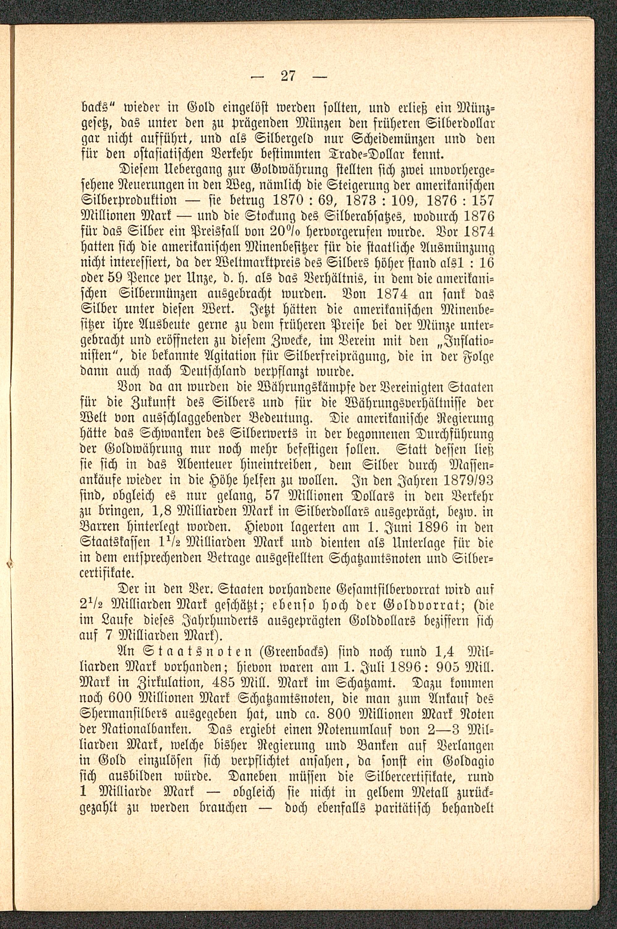 backs" wieder in Gold eingelöst werden sollten, und erließ ein Münz-gesetz, das unter den zu prägenden Münzen den früheren Silberdollargar nicht aufführt, und als Silbergeld nur Scheidemünzen und denfür den ostasiatischen Verkehr bestimmten Trade-Dollar kennt.