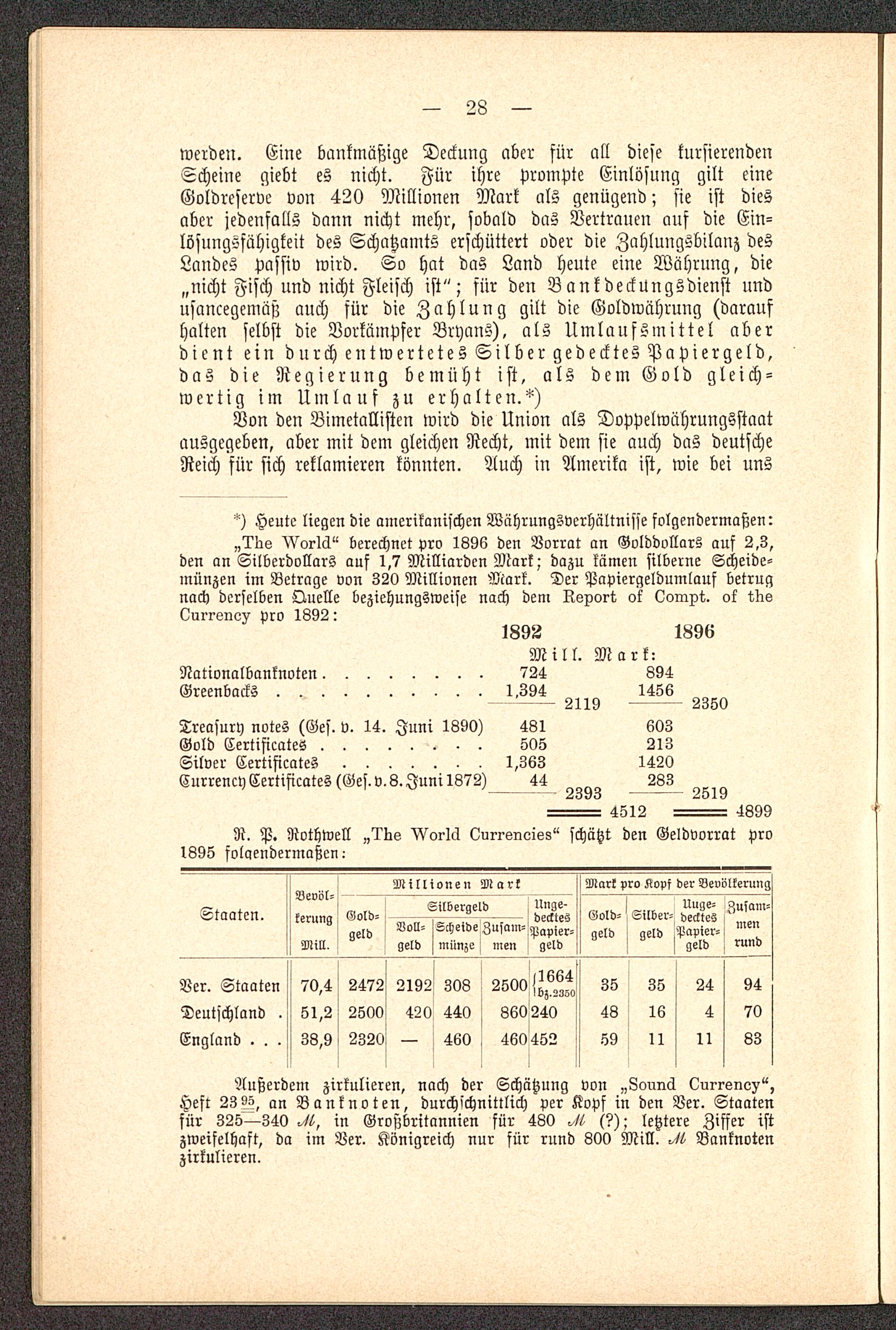Heute liegen die amerikanischen Währungsvcrhältnisse folgendermaßen:„llrs ^Vorlä" berechnet pro 1896 den Vorrat an Golddollars auf 2,3,den an Silberdollars auf 1,7 Milliarden Mark; dazu kämen silberne Scheide-münzen im Betrage von 320 Millionen Mark. Der Papiergeldumlauf betrugnach derselben Quelle beziehungsweise nach den, Rsport, ok Oompt. ok tds(üurrsnov pro 1L92: