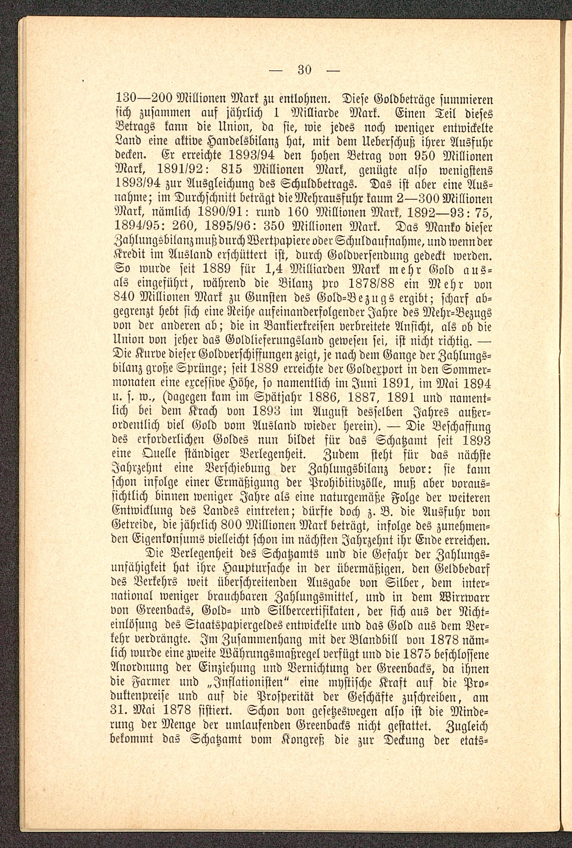 130—200 Millionen Mark zu entlohnen. Diese Goldbeträge summierensich zusammen auf jährlich 1 Milliarde Mark. Einen Teil diesesBetrags kann die Union, da sie, wie jedes noch weniger entwickelteLand eine aktive Handelsbilanz hat, mit dem Ueberschuß ihrer Ausfuhrdecken. Er erreichte 1893/94 den hohen Betrag von 950 MillionenMark, 1891/92: 815 Millionen Mark, genügte also wenigstens1893/94 zur Ausgleichung des Schuldbetrags. Das ist aber eine Aus-nahme; im Durchschnitt betrügt die Mehrausfuhr kaum 2—300 MillionenMark, nämlich 1890/91: rund 160 Millionen Mark. 1892—93: 75,1894/95: 260, 1895/96: 350 Millionen Mark. Das Manko dieserZahlnngsbilanzmnßdnrch Wertpapiere oder Schuldanfnahme, und wennderKredit im Ausland erschüttert ist, durch Goldversendung gedeckt werden.So wurde seit 1889 für 1,4 Milliarden Mark mehr Gold aus-als eingeführt, während die Bilanz pro 1878/88 ein Mehr von840 Millionen Mark zu Gunsten des Gold-B ezngs ergibt; scharf ab-gegrenzt hebt sich eine Reihe aufeiuauderfolgender Jahre des Mehr-Bezugsvon der anderen ab; die in Bankierkreisen verbreitete Ansicht, als ob dieUnion von jeher das Goldlieferungsland gewesen sei, ist nicht richtig. —Die Kurve dieser Goldverschiffungen zeigt, je nach dem Gange der Zahlungs-bilanz große Sprünge; seit 1889 erreichte der Goldexport in den Sommer-monaten eine excessive Höhe, so namentlich im Juni 1891, im Mai 1894u. s. w., (dagegen kam im Spätjahr 1886, 1887, 1891 und nament-lich bei dem Krach von 1893 im August desselben Jahres außer-ordentlich viel Gold vom Ausland wieder herein). — Die Beschaffungdes erforderlichen Goldes nnn bildet für das Schatzamt seit 1893eine Quelle ständiger Verlegenheit. Zudem steht für das nächsteJahrzehnt eine Verschiebung der Zahlungsbilanz bevor: sie kannschon infolge einer Ermäßigung der Prohibitivzölle, muß aber voraus-sichtlich binnen weniger Jahre als eine naturgemäße Folge der weiterenEntwicklung des Landes eintreten; dürfte doch z.B. die Ausfuhr vonGetreide, die jährlich 800 Millionen Mark beträgt, infolge des zunehmen-den Eigenkonsums vielleicht schon ini nächsten Jahrzehnt ihr Ende erreichen.