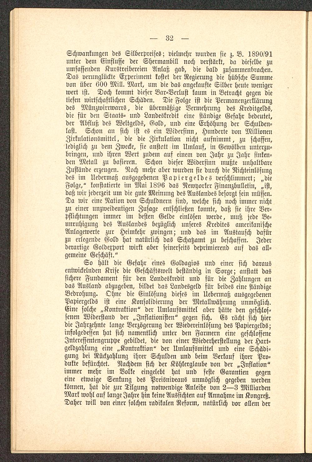 So hält die Gefahr eines Goldagios und einer sich darausentwickelnden Krise die Geschäftswelt beständig in Sorge; anstatt dassichere Fundament für den Landeskredit und für die Zahlungen andas Ausland abzugeben, bildet das Landesgeld für beides eine ständigeBedrohung. Ohne die Einlösung dieses im Uebermaß ausgegebenenPapiergelds ist eine Konsolidierung der Metallwährung unmöglich.Eine solche „Kontraktion" der Umlaufsmittel aber hätte den geschlos-senen Widerstand der „Jnflationisten" gegen sich. Es rächt sich hierdie Jahrzehnte lange Verzögerung der Wiedereinlösung des Papiergelds;infolgedessen hat sich namentlich unter den Farmern eine geschlosseneJnteressentengruppe gebildet, die von einer Wiederherstellung der Hart-geldzahlung eine „Kontraktion" der Umlaufsmittel und eine Schädi-gung bei Rückzahlung ihrer Schulden und beim Verkauf ihrer Pro-dukte befürchtet. Nachdem sich der Köhlerglaube von der „Inflation"immer mehr im Volke eingelebt hat und feste Garantien gegeneine etwaige Senkung des Preisniveaus unmöglich gegeben werdenkönnen, hat die zur Tilgung notwendige Anleihe von 2—3 MilliardenMark wohl auf lange Jahre hin keine Aussichten auf Annahme im Kongreß.Daher will von einer solchen radikalen Reform, natürlich vor allem der