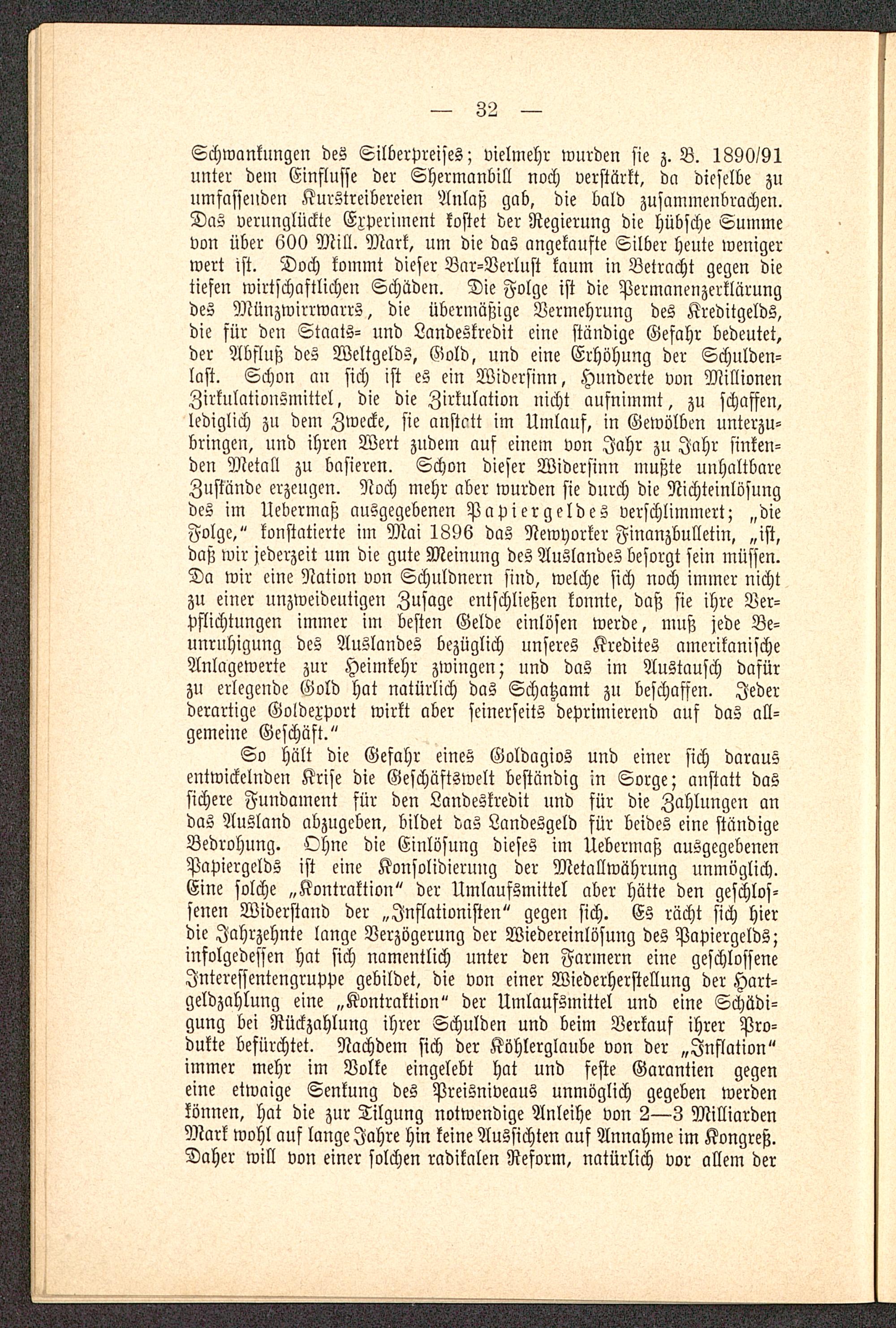 Schwankungen des Silberpreises; vielmehr wurden sie z.B. 1890/91unter dein Einflüsse der Shermcmbill noch verstärkt, da dieselbe zuumfassenden Kurstreibereien Anlaß gab, die bald zusammenbrachen.Das verunglückte Experiment kostet der Regierung die hübsche Summevon über 600 Mill. Mark, um die das angekaufte Silber heute wenigerwert ist. Doch kommt dieser Bar-Verlnst kaum in Betracht gegen dietiefen wirtschaftlichen Schäden. Die Folge ist die Permanenzerklärungdes Münzwirrwarrs, die übermäßige Vermehrung des Kreditgelds,die für den Staats- und Landeskredit eine ständige Gefahr bedeutet,der Abfluß des Weltgelds, Gold, und eine Erhöhung der Schulden-last. Schon au sich ist es ein Widersinn, Hunderte von MillionenZirkulationsmittel, die die Zirkulation nicht aufnimmt, zu schaffen,lediglich zu dem Zwecke, sie anstatt im Umlnnf, in Gewölben unterzu-bringen, und ihren Wert zudem auf eiuem von Jahr zn Jahr sinken-den Metall zu basieren. Schon dieser Widersinn mußte unhaltbareZustände erzeugen. Noch mehr aber wurden sie durch die Nichteinlösungdes im Ueoermaß ausgegebenen Papiergeldes verschlimmert; „dieFolge," konstatierte im Mni 1896 das Newyorier Finanzbulletin, „ist,daß nur jederzeit um die gute Meinung des Auslandes besorgt sein müssen.Da wir eine Nation von Schuldnern sind, welche sich noch immer nichtzu einer unzweideutigen Zusage entschließen konnte, daß sie ihre Ver-pflichtungen immer im besten Gelde einlösen werde, muß jede Be-unruhigung des Auslandes bezüglich unseres Kredites amerikanischeAnlagewerte zur Heimkehr zwingen; und das im Austausch dafürzu erlegende Gold hat natürlich das Schatzamt zu beschaffen. Jederderartige Goldexport wirkt aber seinerseits deprimierend auf das all-gemeine Geschäft."