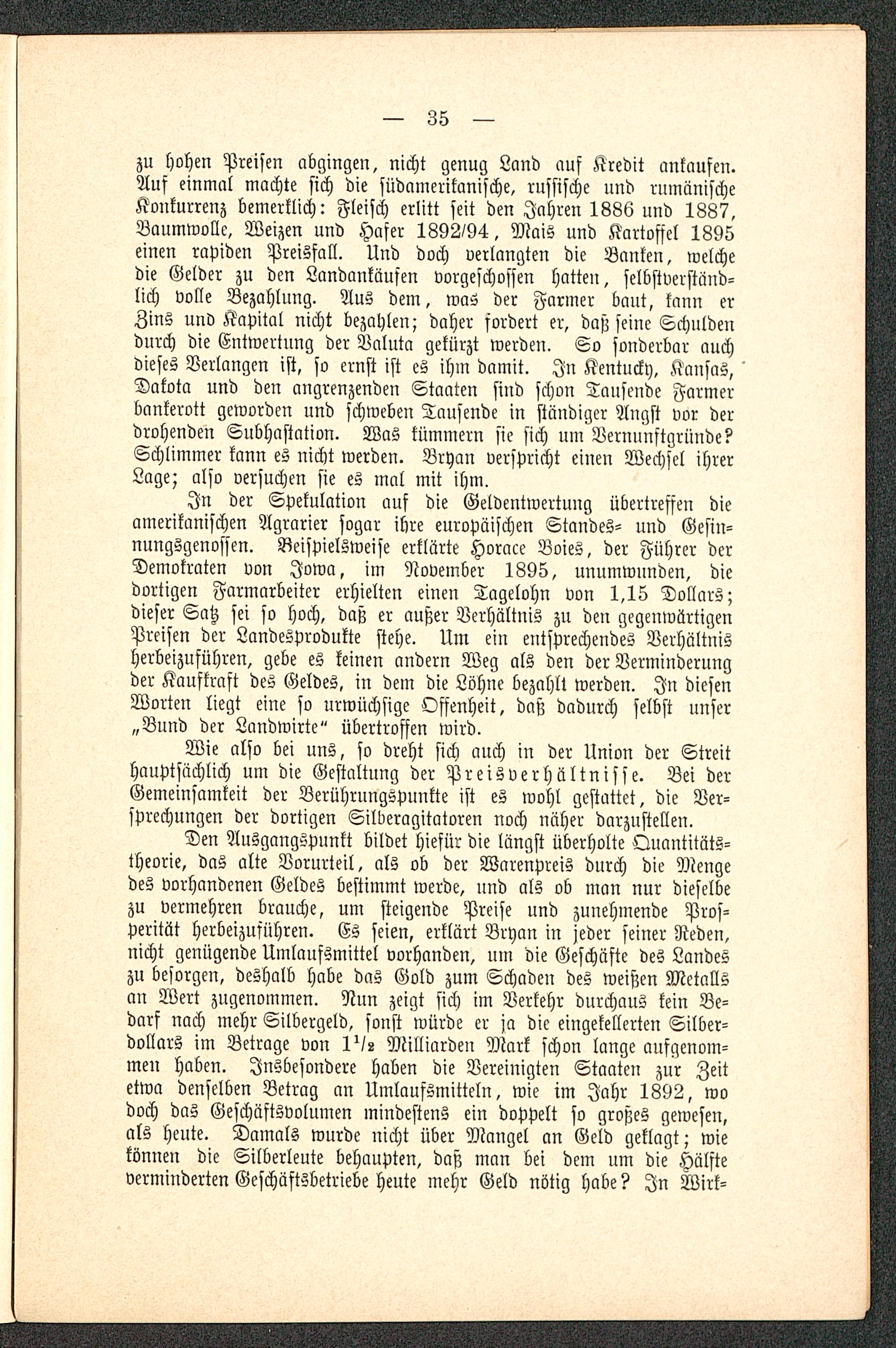 In der Spekulation auf die Geldentwertung übertreffen dieamerikanischen Agrarier sogar ihre europäischen Standes- und Gesin-nungsgenossen. Beispielsweise erklärte Horace Boies , der Führer derDemokraten von Iowa , im November 1895, unumwunden, diedortigen Farmarbeiter erhielten einen Tagelohn von 1,15 Dollars;dieser Satz sei so hoch, daß er außer Verhältnis zu den gegenwärtigenPreisen der Landesprodukte stehe. Um ein entsprechendes Verhältnisherbeizuführen, gebe es keinen andern Weg als den der Verminderungder Kaufkraft des Geldes, in dem die Löhne bezahlt werden. In diesenWorten liegt eine so urwüchsige Offenheit, daß dadurch selbst unser„Bund der Landwirte" übertroffen wird.