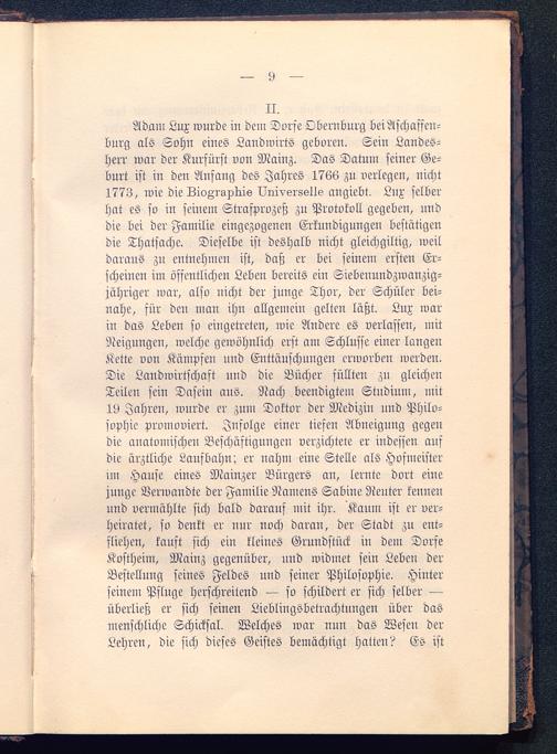 Adam Lux wurde in dem Dorfe Obernburg bei Aschaffen-burg als Sohn eines Landwirts geboren. Sein Landes-herr war der Kurfürst von Mainz . Das Datum seiner Ge-burt ist in den Anfang des Jahres 1766 zu verlegen, nicht1773, wie die LioZraptiis Universelle angiebt. Lux selberhat es so in seinem Strafprozeß zu Protokoll gegeben, nnddie bei der Familie eingezogenen Erkundigungen bestätigendie Thatsache. Dieselbe ist deshalb nicht glcichgiltig, weildaraus zu entnehmen ist, daß er bei seinem ersten Er-scheinen im öffentlichen Leben bereits ein Siebenundzwanzig-jähriger mar, also uicht der junge Thor, der Schüler bei-nahe, für den man ihn allgemein gelten läßt. Lux warin das Leben so eingetreten, wie Andere es verlassen, mitNeigungen, welche gewöhnlich erst am Schlüsse einer langenKette von Kämpfen und Enttäuschungen erworben werden.Die Landwirtschaft und die Bücher füllten zu gleichenTeilen sein Dasein ans. Nach beendigtem Studium, mit19 Jahren, wurde er zum Doktor der Medizin und Philo-sophie promoviert. Infolge einer tiefen Abneigung gegendie anatomischen Beschäftigungen verzichtete er indessen aufdie ärztliche Laufbahn; er nahm eine Stelle als Hofmeisterun Hause eines Mainzer Bürgers an, lernte dort einejunge Verwandte der Familie Namens Sabine Reuter kennenund vermählte sich bald darauf mit ihr. Kaum ist er ver-heiratet, so denkt er nur noch daran, der Stadt zu ent-fliehen, kauft sich ein kleines Grundstück in dem DorfeKostheim, Mainz gegenüber, und widmet sein Leben derBestellung seines Feldes und seiner Philosophie. Hinterseinem Pfluge herschreitend — so schildert er sich selber —überließ er sich seinen Lieblingsbetrachtungen über dasmenschliche Schicksal. Welches war nun das Wesen derLehren, die sich dieses Geistes bemächtigt hatten? Es ist