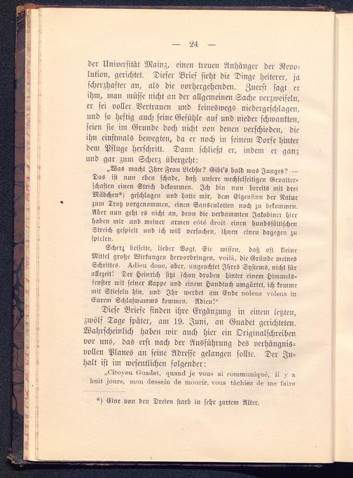 der Universität Mainz, einen treuen Anhänger der Revo-lution, gerichtet. Dieser Brief sieht die Dinge heiterer, jascherzhafter an, als die vorhergehenden. Zuerst sagt erihm, man müsse nicht au der allgemeinen Sache verzweifeln,er sei voller Vertrauen und keineswegs niedergeschlagen,und so heftig auch seine Gefühle auf und nieder schwankten,seien sie im Grunde doch uicht vou denen verschieden, dieihn einstmals bewegten, da er noch in seinem Dorfe hinterdem Pfluge herschritt. Dauu schließt er, indem er ganzund gar zum Scherz übergeht: