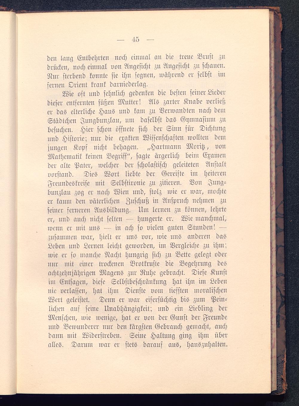 Wie oft und sehnlich gedenken die besten seiner Liederdieser entfernten süßeu Mutter! Als zarter Knabe verlies;er das elterliche Haus uud kam zu Verwandten nach demStädtchen Juugbuuzlau, um daselbst das Gymnasium zubesuchen. Hier schon öffnete sich der Sinn für Dichtungund Historie; uur die exakten Wissenschaften wollten demjungen Kopf nicht behagen. „Hartmann Moritz, vonMathematik keinen Begriff", sagte ärgerlich beim Exameuder alte Pater, welcher der scholastisch geleiteten Anstaltvorstand. Dies Wort liebte der Gereifte im heiterenFreundeskreise niit Selbstironie zu zitieren. Von Juug-bunzlau zog er uach Wien und, stolz wie er war, mochteer kaum den väterlichen Zuschuß in Anspruch uehmen zuseiuer ferneren Ausbilduug. Um lernen zu können, lehrteer, uud auch uicht selten — hungerte er. Wie mauchmal,wenn er mit uns — in ach so vielen guten Stuuden! —zusammen war, hielt er uns vor, wie nns anderen dasLeben und Lernen leicht geworden, im Vergleiche zu ihm;wie er so manche Nacht hungrig sich zn Bette gelegt odernur mit einer trockenen Brotkruste die Begehruug desachtzehnjährigen Magens zur Ruhe gebracht. Diese Kunstim Entsagen, diese Selbstbeschränkung hat ihn im Lebeunie verlassen, hat ihm Dienste vom tiefsten moralischenWert geleistet. Denn er war eifersüchtig bis zum Pein-lichen aus seine Unabhängigkeit; uud ein Liebling derMenschen, wie wenige, hat er von der Gunst der Freundeund Bewunderer nur den kärgsten Gebrauch gemacht, auchdauu mit Widerstreben. Seine Haltuug ging ihm überalles. Darum war er stets daraus aus, hauszuhalten.