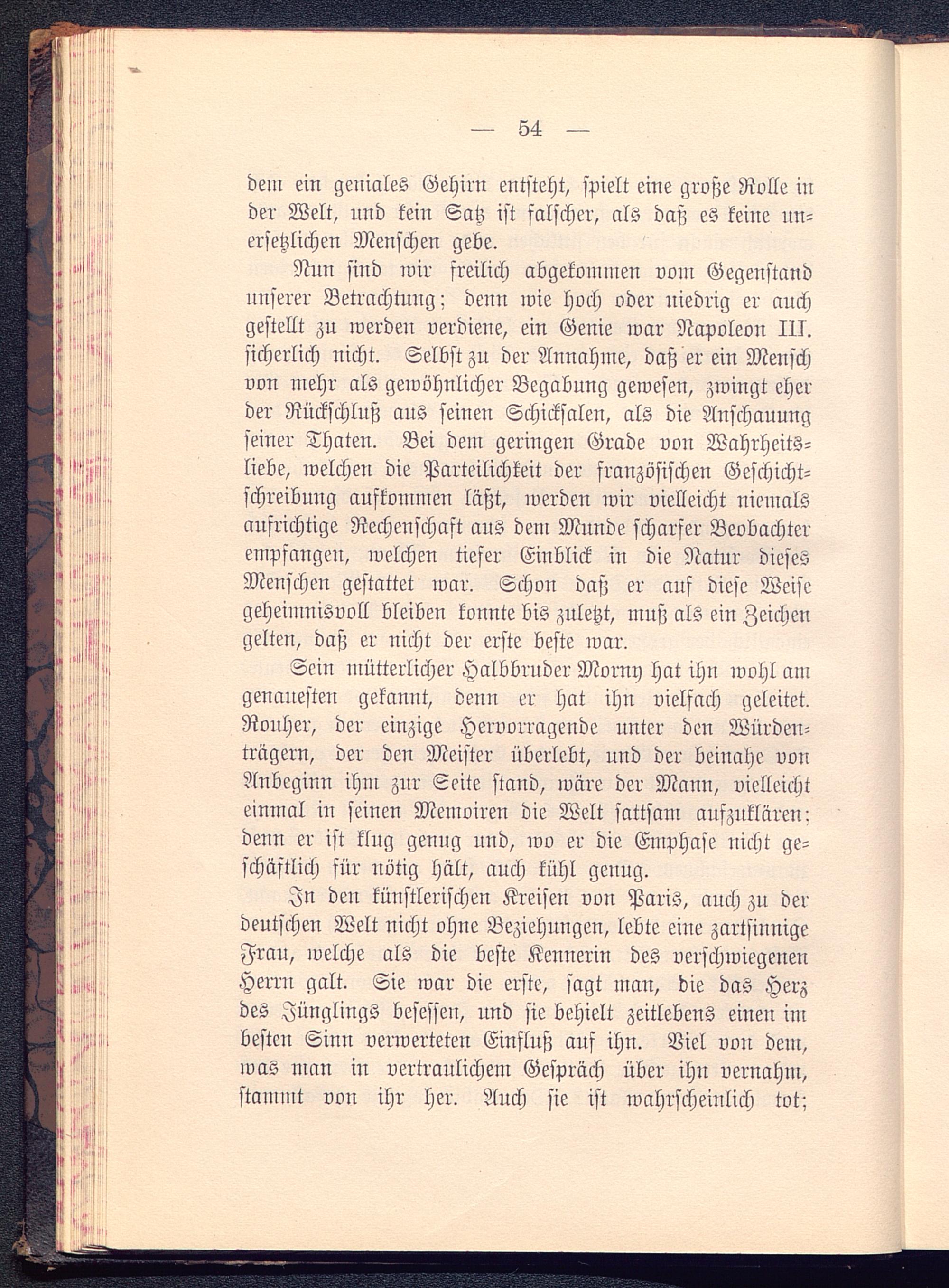 Sein mütterlicher Halbbruder Mornu hat ihn wohl amgenauesten gekannt, denn er hat ihn vielfach geleitet.Rouher, der einzige Hervorragende unter den Würden-trägern, der den Meister überlebt, und der beinahe vonAnbeginn ihm zur Seite stand, wäre der Mann, vielleichteinmal in seinen Memoiren die Welt sattsam aufzuklären-denn er ist klug genug und, wo er die Emphase nicht ge-schäftlich sür nötig hält, auch kühl genug.