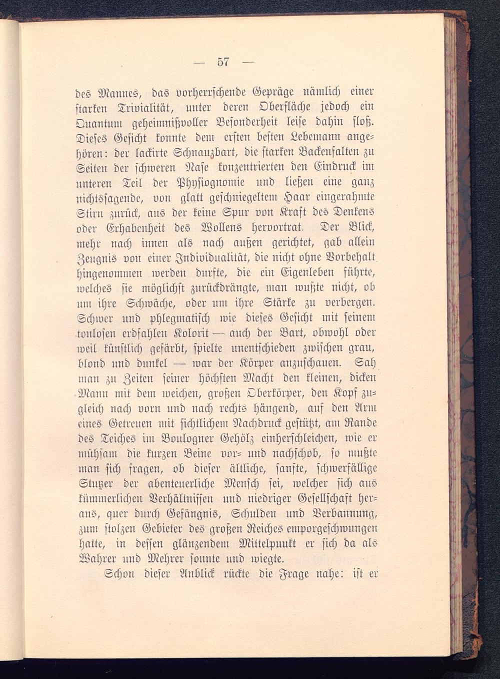 des Mannes, das vorherrschende Gepräge nämlich einerstarken Trivialität, unter deren Oberfläche jedoch einQuantum geheimnißvoller Besonderheit leise dahin floß.Dieses Gesicht konnte dein ersten besten Lebemann ange-hören : der lackirte Schnauzbart, die starken Backcnfalten zuSeiten der schweren Nase konzentrierten den Eindruck imunteren Teil der Physiognomie und ließen eine ganznichtssagende, von glatt geschniegeltem Haar eingerahmteStirn zurück, aus der keine Spur von Kraft des Denkensoder Erhabenheit des Wollens hervortrat, Ter Blick,mehr nach innen als nach außen gerichtet, gab alleinZeugnis von einer Individualität, die nicht ohne Vorbehalthingenommen werden durfte, die ein Eigenleben führte,welches sie möglichst zurückdrängte, man wußte nicht, obum ihre Schwäche, oder um ihre Stärke zn verbergen.Schwer und phlegmatisch wie dieses Gesicht mit seinen:wnlosen erdfahlen Kolorit — anch der Bart, obwohl oderweil künstlich gefärbt, spielte unentschieden zwischen grau,blond und dunkel — war der Körper anzuschauen. Sahman zn Zeiten seiner höchsten Macht den kleinen, dickenMann mit dem weichen, großen Oberkörper, den Kopf zu-gleich nach vorn und nach rechts hängend, auf den Armeines Getreuen mit sichtlichem Nachdruck gestützt, am Ncmdedes Teiches im Boulogner Gehölz einherschleichen, wie ermühsam die kurzen Beine vor- und nachschob, so mußteman sich fragen, ob dieser ältliche, sanfte, schwerfälligeStuyer der abenteuerliche Mensch sei, welcher sich anskümmerlichen Verhältnissen und uiedriger Gesellschaft her-aus, quer durch Gefängnis, Schulden und Verbannung,zum stolzen Gebieter des großen Reiches emporgeschwungenhatte, in dessen glänzendem Mittelpunkt er sich da alsWahrer und Mehrer sonnte und wiegte.