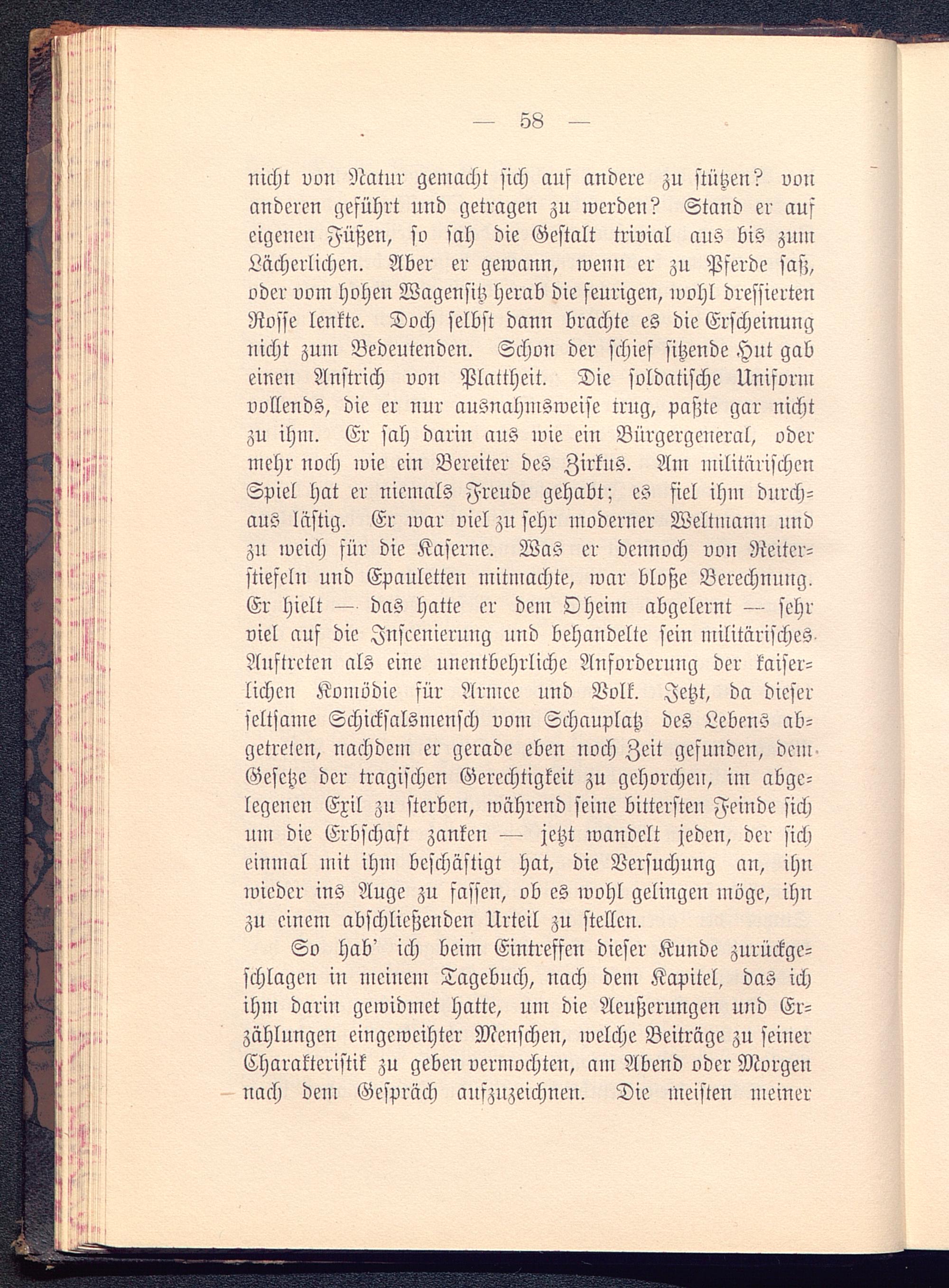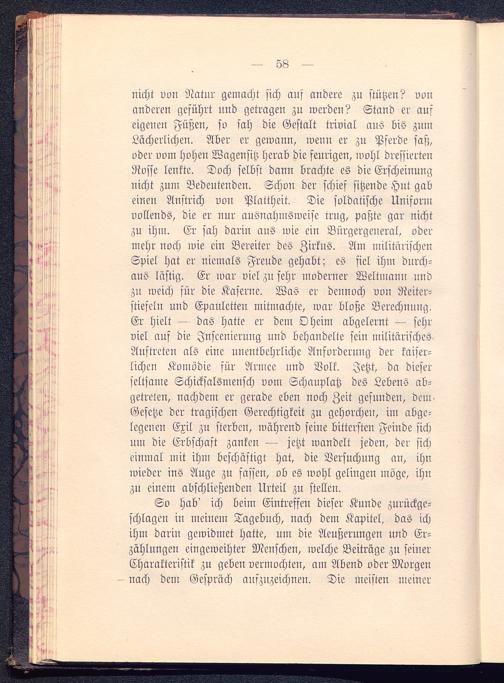 nicht vvu Natur gemacht sich auf andere zu stützen? vonanderen geführt und getragen zu werdeu? Stand er auseigenen Füßen, so sah die Gestalt trivial aus bis zumLächerlichen. Aber er gewann, wenn er zu Pferde saß,oder vom hoheu Wagensitz herab die feurigen, wohl dressiertenRosse lenkte. Doch selbst dann brachte es die Erscheinunguicht zum Bedeutenden. Schon der schief sitzende Hut gabeinen Anstrich von Plattheit. Die soldatische Uniformvollends, die er nur ausnahmsweise trug, paßte gar nichtzu ihm. Er sah dariu aus wie ein Bürgergeneral, odermehr noch wie ein Bereiter des Zirkus. Am militärischenSpiel hat er niemals Freude gehabt; es siel ihm durch-aus lästig. Er war viel zu sehr moderner Weltmann nndzn weich für die Kaserne. Was er dennoch von Reiter-stiefeln uud Epauletteu mitmachte, war bloße Berechnung.Er hielt — das hatte er dem Oheim abgelernt — sehrviel auf die Inszenierung und behandelte sein militärischesAuftreten als eine unentbehrliche Anforderung der kaiser-lichen Komödie sür Armee und Volk. Jetzt, da dieserseltsame Schicksalsmensch vom Schauplatz des Lebens ab-getreten, nachdem er gerade eben noch Zeit gesunden, dem-Gesetze der tragischen Gerechtigkeit zu gehorchen, im abge-legenen Exil zu sterben, während seine bittersten Feinde sichum die Erbschaft zanken — jetzt wandelt jeden, der sicheinmal mit ihm beschäftigt hat, die Versuchung an, ihnwieder ins Auge zu fassen, ob es wohl gelingen möge, ihnzu einem abschließenden Urteil zu stellen.