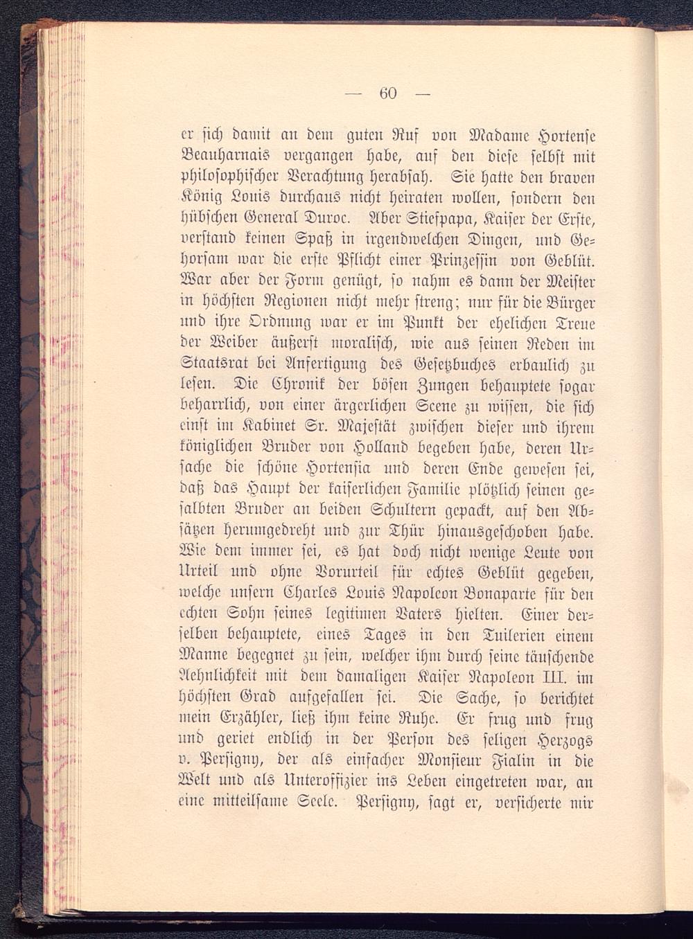 er sich damit an dem guten Ruf von Madame HortenseBeauharnais vergangen habe, auf den diese selbst mitphilosophischer Verachtung herabsah. Sie hatte den bravenKönig Louis durchaus nicht heiraten wollen, sondern denbübschen General Duroc, Aber Sticfpapa, Kaiser der Erste,vcrstaud keinen Spaß in irgendwelchen Diugen, uud Ge-horsam mar die erste Pflicht einer Prinzessin von Geblüt.War aber der Form genügt, so nahm es dann der Meisterin höchsten Regionen nicht mehr streng; nur für die Bürgerund ihre Ordnung war er im Punkt der ehelichen Treueder Weiber äußerst moralisch, wie aus seinen Reden imStaatsrat bei Anfertigung des Gesetzbuches erbaulich zulesen. Die Ehronik der bösen Znngen behauptete sogarbeharrlich, von einer ärgerlichen Scene zu wissen, die sicheinst im Kabinet Sr. Majestät zwischen dieser und ihremköniglichen Bruder von Holland begeben habe, deren Ur-sache die schöne Hortensia und deren Ende gewesen sei,daß das Haupt der kaiserlichen Familie plötzlich seinen ge-salbten Bruder an beiden Schultern gepackt, auf den Ab-sätzen herumgedreht und zur Thür hiuausgeschoben habe.Wie dem immer sei, es hat doch nicht wenige Leute vonUrteil und ohne Bornrteil für echtes Geblüt gegeben,welche unfern Charles Louis Napolcou Bonaparte für denechtcu Sohn seines legitimen Vaters hielten. Einer der-selben behauptete, eines Tages in den Tuilericn einemManue begegnet zu sein, welcher ihm durch seine täuschendeAchnlichlcit mit dem damaligen Kaiser Napoleon III. imhöchsten Grad aufgefallen sei. Die Sache, so berichtetmein Erzähler, ließ ihm keine Ruhe. Er frug und fruguud geriet endlich in der Person des seligen Herzogsv. Persigm), der als einfacher Monsieur Fialin in dieWelt und als Unteroffizier ins Leben eingetreten war, aneine mitteilsame Seele. Persigny , sagt er, versicherte mir