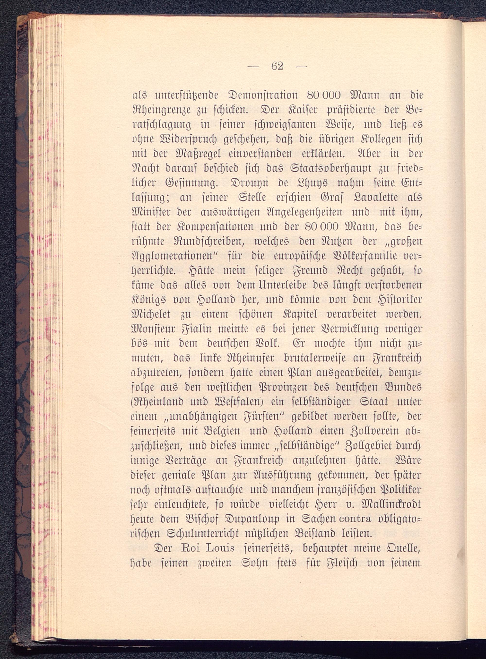 als unterstützende Demonstration 80 000 Mann an dieRheingrenze zu schicken. Der Kaiser präsidierte der Be-ratschlagung in seiuer schweigsamen Weise, und ließ esohne Widerspruch geschehen, daß die übrigen Kollegen sichmit der Maßregel einverstanden erklärten. Aber in derNacht darauf beschied sich das Staatsoberhaupt zu fried-licher Gesinnung. Drounn de Lhuys nahm seine Ent-lassung; an seiuer Stelle erschien Graf Lavalette alsMinister der auswärtigen Angelegenheiten und mit ihm,statt der Kompensationen und der 80 000 Mann, das be-rühmte Rundschreiben, welches den Nutzen der „großenAgglomerationen" für die europäische Völkerfamilie ver-herrlichte. Hätte mein seliger Freund Recht gehabt, sokäme das alles von dem Unterleibe des längst verstorbenenKönigs von Holland her, und könnte von dem HistorikerMichelet zu einem schönen Kapitel verarbeitet werden.Monsieur Fialin meinte es bei jener Verwicklung wenigerbös mit dem deutschen Volk. Er mochte ihm nicht zu-muten, das linke Rheinufer brutalerweise an Frankreich abzutreten, sondern hatte einen Plan ausgearbeitet, demzu-folge aus den westlichen Provinzen des deutschen Bundes«Aheinland und Westfalen) ein selbständiger Staat untereinem „unabhängigen Fürsten " gebildet werden sollte, derseinerseits mit Belgien und Holland einen Zollverein ab-zuschließen, nnd dieses immer „selbständige" Zollgebiet durchinnige Verträge an Frankreich anzulehnen hätte. Wäredieser geniale Plan zur Ausführung gekommen, der späternoch oftmals auftauchte und manchem französischen Politikersehr einleuchtete, so würde vielleicht Herr v. Mallinckrodtheute dem Bischof Dnpanloup in Sachen c-onti-g. obligato-rischen Schulunterricht nützlichen Beistand leisten.