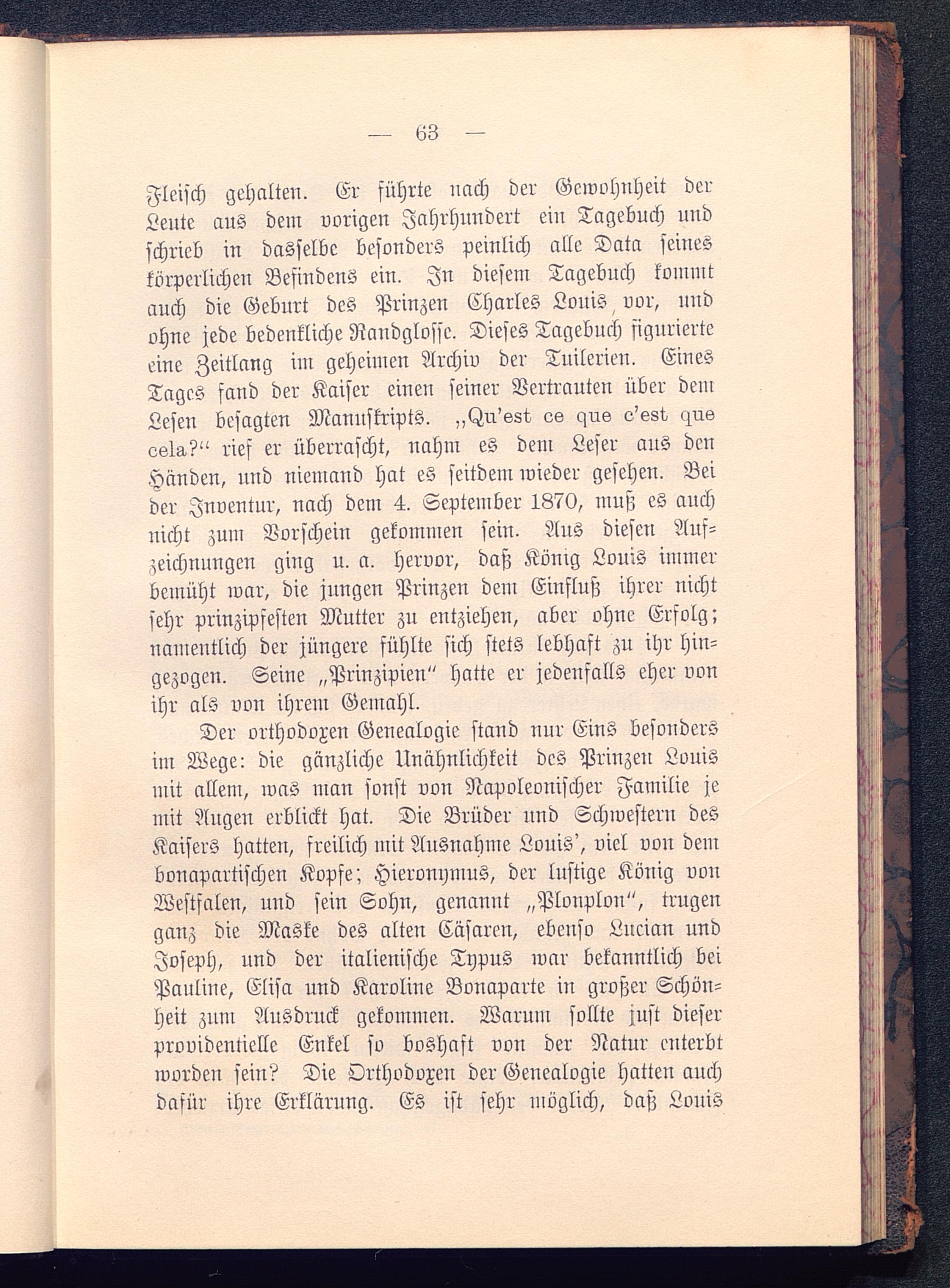 Fleisch gehalten. Er führte nach der Gewohnheit derLeute aus dem vorigen Jahrhundert ein Tagebuch undschrieb in dasselbe besonders peinlich alle Data seineskörperlichen Befindens ein. In diesem Tagebuch kommtauch die Geburt des Prinzen Charles Louis vor, uudohne jede bedenkliche Randglosse, Dieses Tagebuch figurierteeine Zeitlang im geheimen Archiv der Tuilerien. EinesTages fand der Kaiser einen seiner Vertrauten über demLesen besagten Mannskripts. „Hn'sst os qus <z'e8t, c^usosls,?" rief er überrascht, nahm es dem Leser aus denHänden, und niemand hat es seitdem wieder gesehen. Beider Inventur, nach dem 4. September 1870, muß es auchnicht zum Vorschein gekommen sein. Aus dieseu Auf-zeichnungen ging u. a. hervor, daß König Louis immerbemüht war, die jungen Prinzen dem Einfluß ihrer nichtsehr prinzipfesten Mutter zu entziehen, aber ohne Erfolg;namentlich der jüngere fühlte sich stets lebhaft zu ihr hin-gezogen. Seine „Prinzipien" hatte er jedenfalls eher vonihr als von ihrem Gemahl.