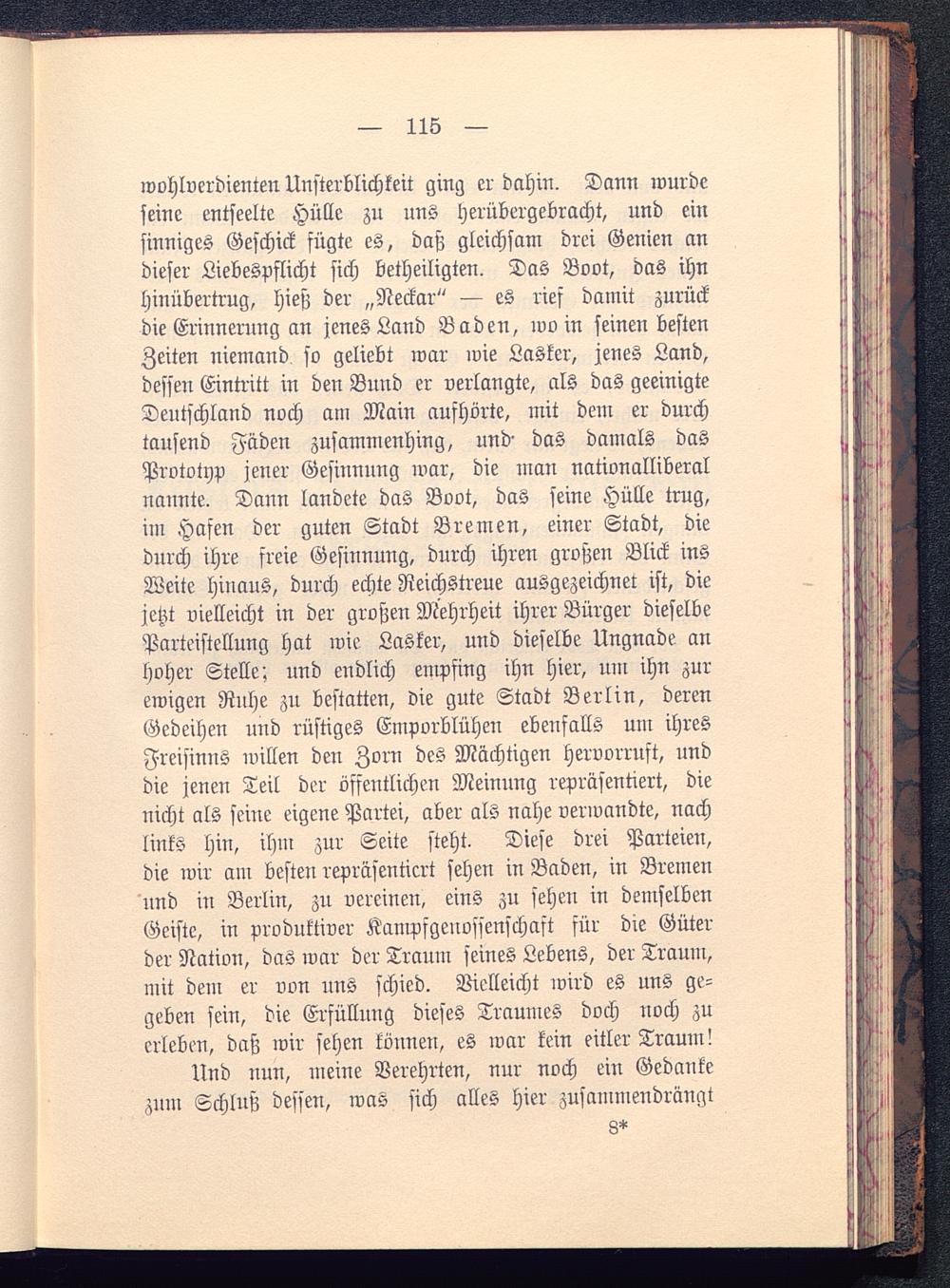 wohlverdienten Unsterblichkeit ging er dahin. Dann wurdeseine entseelte Hülle zu uns herübergebracht, und einsinniges Geschick fügte es, daß gleichsam drei Genien andieser Liebespflicht sich betheiligten. Das Boot, das ihnhinübertrug, hieß der „Neckar " — es rief damit zurückdie Erinnerung an jenes Land Baden , wo in seinen bestenZeiten niemand so geliebt war wie Lasker, jenes Land,dessen Eintritt in den Bund er verlangte, als das geeinigteDeutschland noch am Main aufhörte, mit dem er durchtausend Fäden zusammenhing, und- das damals dasPrototyp jener Gesiunung war, die man nationalliberalnannte. Dann landete das Boot, das seine Hülle trug,im Hafen der guten Stadt Bremen , einer Stadt, diedurch ihre freie Gesinnung, durch ihren großen Blick insWeite hinaus, durch echte Reichstreue ausgezeichnet ist, diejetzt vielleicht in der großen Mehrheit ihrer Bürger dieselbeParteistcllung hat wie Lasker, und dieselbe Ungnade anhoher Stelle; und endlich empfing ihn hier, um ihn zurewigen Rnhe zu bestatten, die gute Stadt Berlin , derenGedeihen uud rüstiges Emporblühen ebenfalls um ihresFreisinns willen den Zorn des Mächtigen hervorruft, unddie jenen Teil der öffentlichen Meinung repräsentiert, dienicht als seine eigene Partei, aber als nahe verwandte, nachlinks hin, ihm zur Seite steht. Diese drei Parteien,die wir am besten repräsentiert sehen in Baden, in Bremen und in Berlin , zu vereinen, eins zu sehen in demselbenGeiste, in produktiver Kampfgenossenschaft für die Güterder Nation, das war der Traum seines Lebens, der Traum,mit dem er von uns schied. Vielleicht wird es uns ge-geben sein, die Erfüllung dieses Traumes doch noch zuerleben, daß wir sehen können, es war kein eitler Traum!