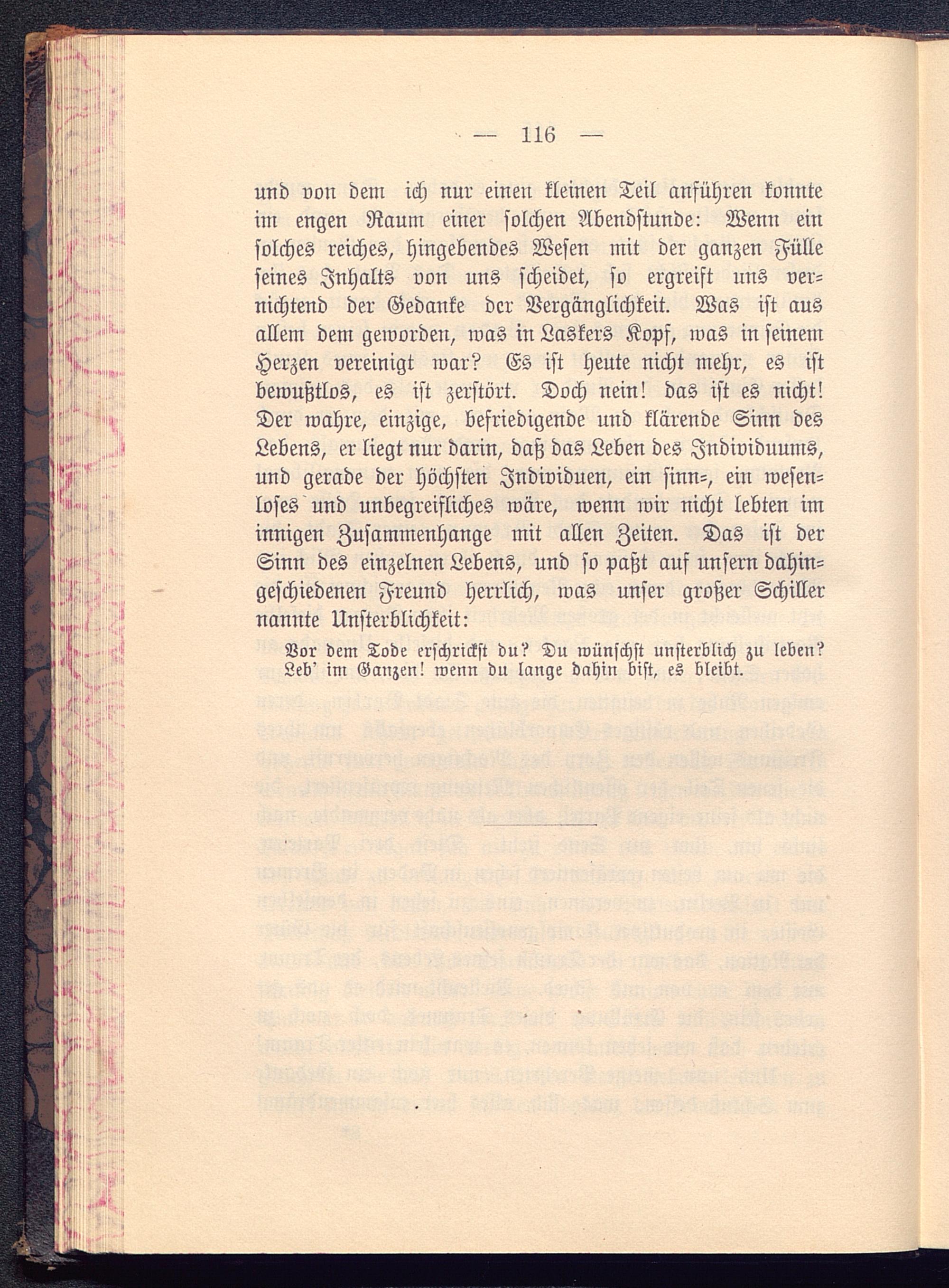und von dem ich nur einen kleinen Teil anführen konnteim engen Raum einer solchen Abendstunde: Wenn einsolches reiches, hingebendes Wesen mit der ganzen Fülleseines Inhalts von uns scheidet, so ergreift uns ver-nichtend der Gedanke der Vergänglichkeit. Was ist ausallem dem geworden, was in Laskers Kopf, was in seinemHerzen vereinigt war? Es ist heute nicht mehr, es istbewußtlos, es ist zerstört. Doch nein! das ist es nicht!Der wahre, einzige, befriedigende und klärende Sinn desLebens, er liegt nur darin, daß das Leben des Individuums,und gerade der höchsten Individuen, ein sinn-, ein wesen-loses und unbegreifliches wäre, wenn wir nicht lebten iminnigen Zusammenhange mit allen Zeiten. Das ist derSinn des einzelnen Lebens, und so paßt aus unfern dahin-geschiedenen Freund herrlich, was unser großer Schillernannte Unsterblichkeit: