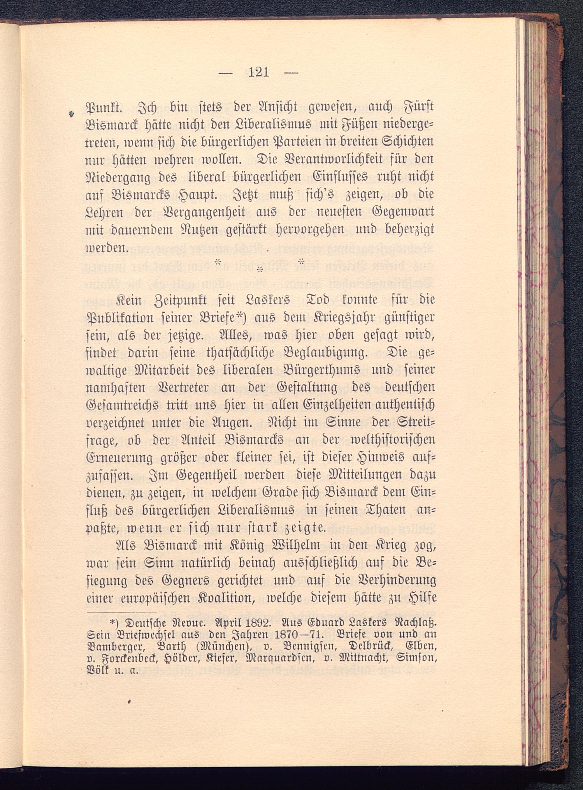 Kein Zeitpunkt seit Lasters Tod konnte für diePublikation seiuer Briefe") aus dem Kriegsjahr günstigersein, als der jetzige. Alles, was hier oben gesagt wird,findet darin seine tatsächliche Beglaubigung. Die ge-waltige Mitarbeit des liberalen Bürgerthnms uud seinernamhaften Vertreter an der Gestaltung des deutschenGesamtreichs tritt uns hier in allen Einzelheiten authentischverzeichnet unter die Augen. Nicht im Sinne der Streit-frage, ob der Anteil Bismarcks an der welthistorischenErneuerung größer oder kleiner sei, ist dieser Hinweis auf-zufassen. Im Gegentheil werden diese Mitteilungen dazudienen, zu zeigen, in welchem Grade sich Bismarck dem Ein-fluß des bürgerlichen Liberalismus in seinen Thaten an-paßte, wenn er sich nur stark zeigte.