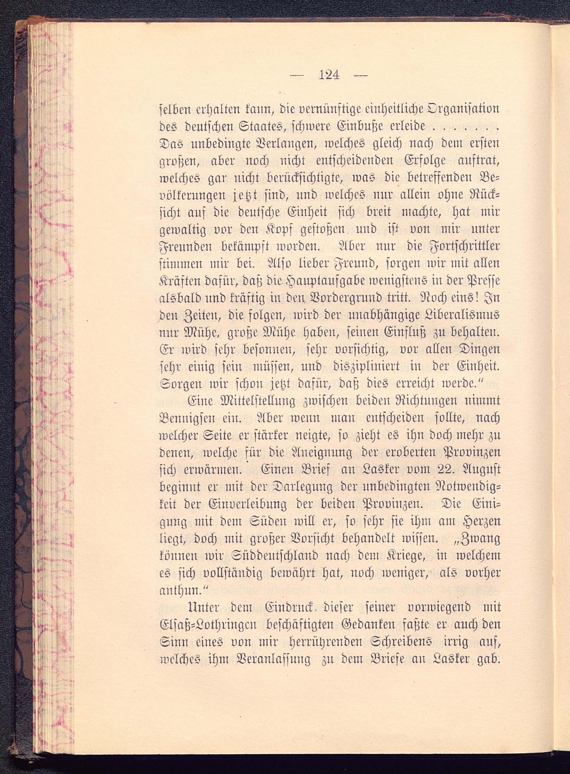 Unter dem Eindruck, dieser seiner vorwiegend mitElsaß-Lothringen beschäftigten Gedanken faßte er auch denSinn eines von mir herrührenden Schreibens irrig auf,welches ihm Veranlassung zu dem Briefe an Lasker gab.
