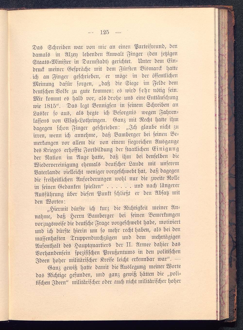„Hiermit dürfte ich kurz die Richtigkeit meiner An-nahme, daß Herrn Bamberger bei seinen Bemerkungenvorzugsweise die deutsche Frage vorgeschwebt habe, motiviertund ich dürfte hierin um so mehr recht haben, als bei denmassenhaften Truppendurchzügen und dem mehrtägigenAufenthalt des Hauptquartiers der II. Armee dahier dasVorhandensein spezifischen Preußentums in den politischenIdeen hoher militärischer Kreise leicht erkennbar war". -