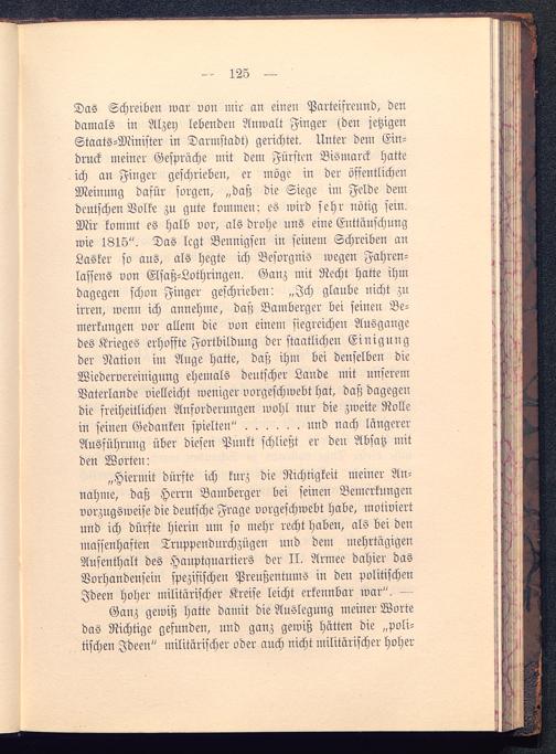 Das Schreiben war von mir an einen Parteifreund, dendamals in Alzey lebenden Anwalt Finger <den jetzigenStaats-Minister in Darmstadt ) gerichtet. Unter dem Ein-druck meiner Gespräche mit dem Fürsten Bismarck hatteich an Finger geschrieben, er möge in der öffentlichenMeinung dafür sorgen, „daß die Siege im Felde demdeutschen Volke zu gute kommein eS wird sehr nötig sein.Mir kommt es halb vor, als drohe uns eine Enttäuschungwie 1815". Das legt Bennigsen in seinem Schreiben anLaster so aus, als hegte ich Besorgnis wegen Fahren-lassens von Elsaß-Lvthriugeu. Ganz mit Recht hatte ihmdagegen schon Finger geschrieben' „Ich glaube uicht zuirren, wenn ich annehme, daß Bamberger bei seinen Be-merkungen vor allem die von einem siegreichen Ausgangedes Krieges erhoffte Fortbildung der staatlichen Einigungder Nation im Auge hatte, daß ihm bei denselben dieWiedervereinigung ehemals deutscher Laude mit unseremVaterlande vielleicht weniger vorgeschwebt hat, daß dagegendie freiheitlichen Anforderungen wohl nur die zweite Rolle
