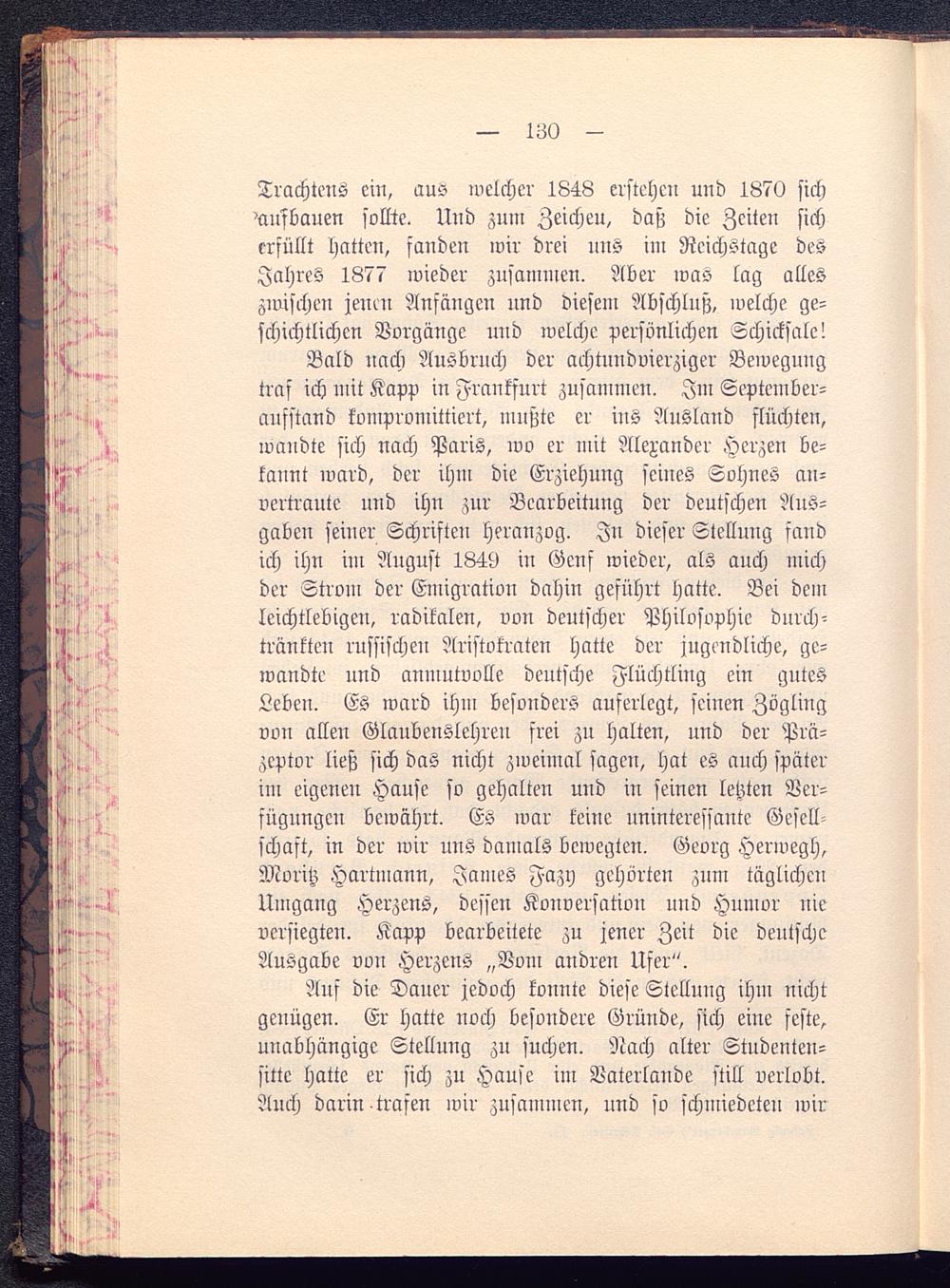 Bald nach Ausbruch der achtnudvierziger Bewegungtraf ich mit Kapp in Frankfurt zusammen. Im September-aufstand kompromittiert, mußte er ius Ausland flüchten,wandte sich nach Paris, wo er mit Alexander Herzen be-kannt ward, der ihm die Erziehung seines Sohnes an-vertraute und ihn zur Bearbeitung der deutschen Aus-gaben seiner Schriften heranzog. In dieser Stellung fandich ihn im August 1849 in Genf wieder, als auch michder Strom der Emigration dahin geführt hatte. Bei demleichtlebigen, radikalen, von deutscher Philosophie durch-tränkten russischen Aristokraten hatte der jugendliche, ge-wandte und anmutvolle deutsche Flüchtling ein gntesLeben. Es ward ihm besonders auferlegt, seinen Zöglingvon allen Glaubenslehren frei zu halten, und der Prä-zeptor ließ sich das nicht zweimal sagen, hat es auch späterim eigenen Hause so gehalten und in seinen letzten Ver-fügungen bewährt. Es war leine uninteressante Gesell-schaft, in der wir uns damals bewegten. Georg Herwegh ,Moritz Hartmann, James Fazy gehörten zum täglichenUmgang Herzens, dessen Konversation und Humor uieversiegten. Kapp bearbeitete zu jener Zeit die deutscheAusgabe von Herzens „Vom andren Ufer".