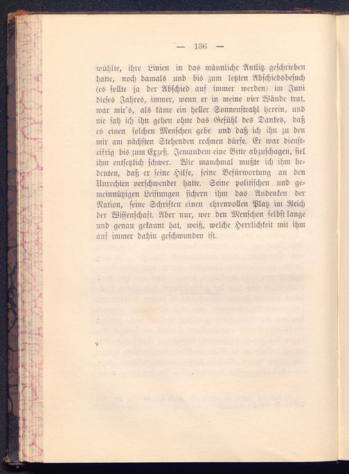 wühlte, ihre Linien in das männliche Antlitz geschriebenhatte, noch damals nnd bis zum letzten Abschiedsbesuch(es sollte ja der Abschied auf immer werden) im Junidieses Jahres, immer, wenn er in meine vier Wände trat,war mir'o, als käme ein Heller Sonnenstrahl herein, undnie sah ich ihn gehen ohne das Gefühl des Dankes, daßeo einen solchen Menschen gebe und daß ich ihn zu denmir an? nächsten Stehenden rechnen dürfe. Er war dienst-eifrig bis znm Exzeß. Jemandem eine Bitte abznschagen, fielihm entsetzlich schwer. Wie manchmal mußte ich ihm be-deuten, daß er seine Hilfe, seine Befürwortung an denUnrechten verschwendet hatte. Seine politischen nnd ge-meinnützigen Leistungen sichern ihm das Andenken derNation, seine Schriften einen ehrenvollen Platz im Reichder Wissenschaft. Aber nur, wer den Menschen selbst langennd geuau gekannt hat, iveiß, welche Herrlichkeit mit ihmans immer dahin geschwunden ist.