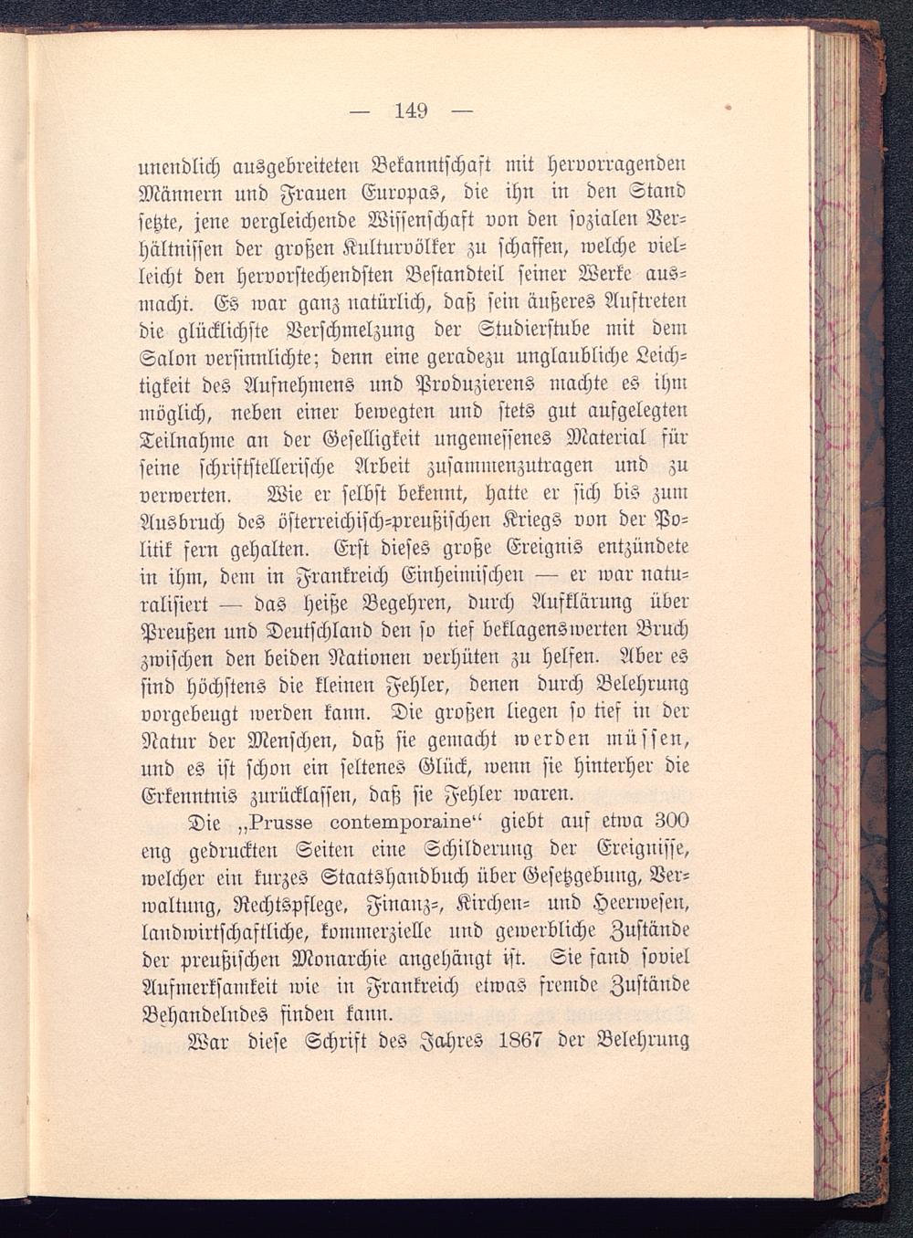 unendlich ausgebreiteten Bekanntschaft mit hervorragendenMännern und Frauen Europas , die ihn in den Standsetzte, jene vergleichende Wissenschaft von den sozialen Ver-hältnissen der großen Kulturvölker zu schaffen, welche viel-leicht den hervorstechendsten Bestandteil seiner Werke aus-macht. Es war ganz natürlich, daß sein äußeres Auftretendie glücklichste Verschmelzung der Studierstube mit demSalon versinnlichte; denn eine geradezu unglaubliche Leich-tigkeit des Aufnehmens und Produzierens machte es ihmmöglich, neben einer bewegten und stets gut aufgelegtenTeilnahme an der Geselligkeit ungemessenes Material fürseine schriftstellerische Arbeit zusammenzutragen und zuverwerteu. Wie er selbst bekennt, hatte er sich bis zumAusbruch dcs österreichisch-preußischen Kriegs von der Po-litik fern gehalten. Erst dieses große Ereignis entzündetein ihm, dem in Frankreich Einheimischen — er war natu-ralisiert — das heiße Begehren, durch Aufklärung überPreußen und Deutschland den so ties beklagenswerten Bruchzwischen den beiden Nationen verhüten zu Helsen . Aber essind höchstens die kleinen Fehler, denen durch Belehrungvorgebeugt werden kann. Die großen liegen so tief in derNatur der Menschen, daß sie gemacht werden müssen,und es ist schon ein seltenes Glück, wenn sie hinterher dieErkenntnis zurücklassen, daß sie Fehler waren.