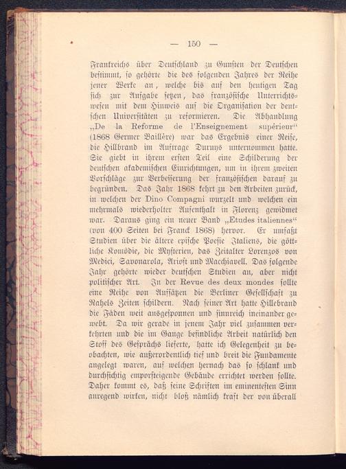 Frankreichs über Deutschland zn Gunsten der Deutschen bestimmt, so gehörte die des folgenden Jahres der Reihejeuer Werte an, welche bis auf deu heutigen Tagsich zur Ausgabe scheu, das srauzösische Unterrichts-wesen mit dem Hinweis ans die Organisation der deut-schen Universitäten ;n reformieren. Die Abhandlung,,Os Iii. Retorrn« cle 1'Lv.8siA»sinknt, Kupsrisur"(1868 Germer Baillere) ivar das Ergebnis einer Reise,die Hillbrand im Austrage Duruus uuteruommcu hatte.Sie giebt in ihrem ersten Teil eine Schilderung derdeutschen akademischen Einrichtungen, nm in ihrem zweitenLorschläge znr Verbesserung der französischen darauf zubegründen. Das Jahr 1868 kehrt zu den Arbeiten zurück,in welchen der vino ^oinpaZQi wurzelt und welchen einmehrmals wiederholter Aufenthalt in Florenz gewidmetwar. Daraus ging ein neuer Band „Lwc!s8 iralivlln.s8"(von 400 Seiten bei Franck 1868) hervor. Er umfaßtStudien über die ältere epische Poesie Italiens , die gött-liche Komödie, die Mysterien, das Zeitalter Lorenzos vonMedici, Savonarola, Ariost und Macchiavell . Das solgendeJahr gehörte wieder deutschen Studien an, aber nichtpolitischer Art. In der Rsvus clss clsnx mouckss sollteeine Reihe von Aussätzen die Berliner Gesellschaft zuRahels Zeiten schildern. Nach seiner Art hatte Hillebranddie Fäden weit ansgesponnen und sinnreich ineinander ge-webt. Da wir gerade in jenem Jahr viel zusammen ver-kehrten und die im Gange befindliche Arbeit natürlich denStoff des Gesprächs lieferte, hatte ich Gelegenheit zu be-obachten, wie außerordentlich tief und breit die Fundamenteangelegt waren, auf welchen hernach das so schlank unddurchsichtig emporstrigeude Gebäude errichtet werdeu sollte.Daher kommt es, daß seine Schriften im eminentesten Sinnanregend wirken, nicht bloß nämlich kraft der von überall
