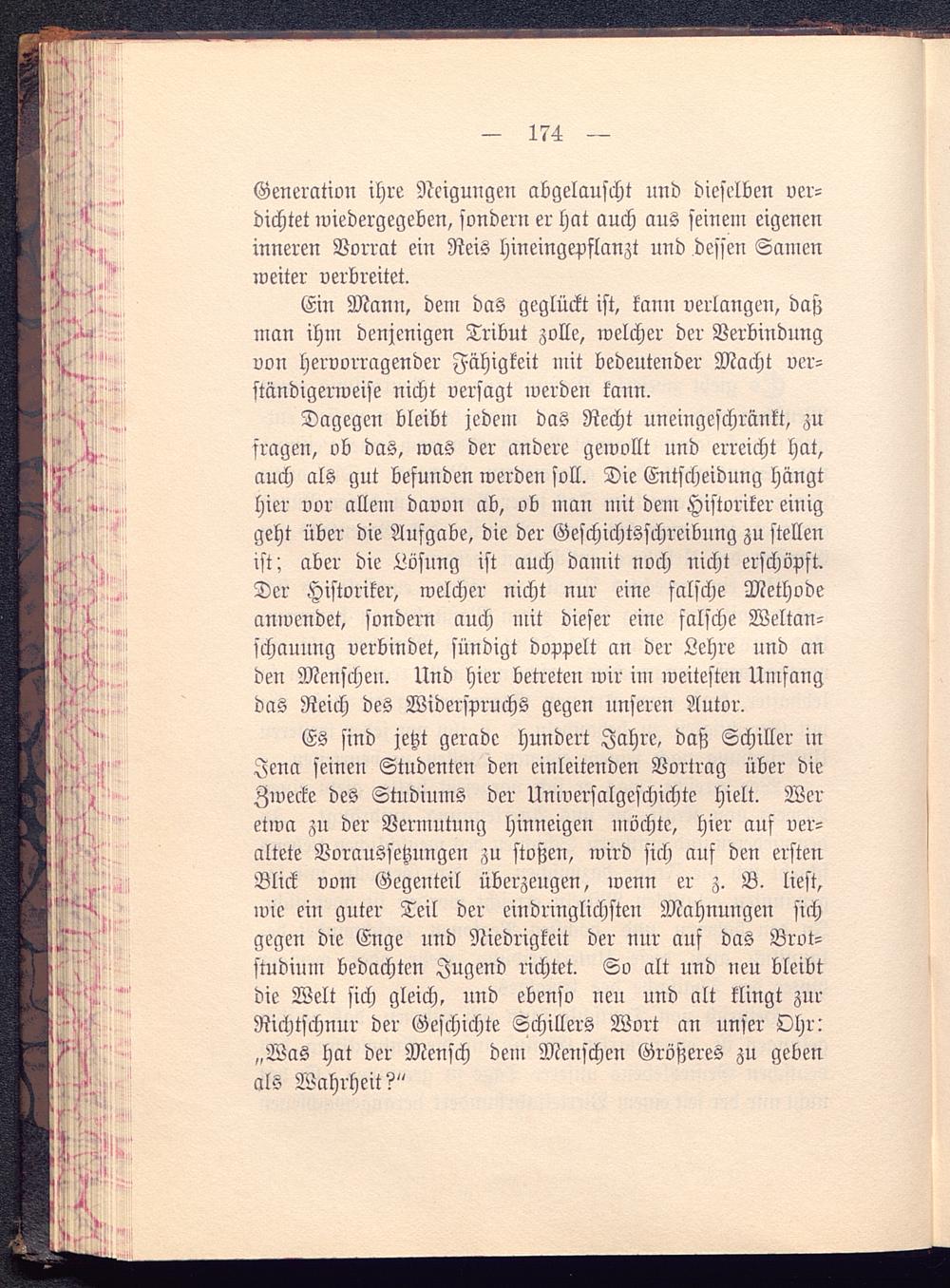 Es sind jetzt gerade hundert Jahre, daß Schiller inJena seinen Studenten den einleitenden Vortrag über dieZwecke des Studiums der Universalgeschichte hielt. Weretwa zu der Vermutung hinneigen möchte, hier auf ver-altete Voraussetzungen zu stoßen, wird sich auf den erstenBlick vom Gegenteil überzeugen, wenn er z. B. liest,wie ein guter Teil der eindringlichsten Mahnungen sichgegen die Enge und Niedrigkeit der nur auf das Brot-siudium bedachten Jugend richtet. So alt und neu bleibtdie Welt sich gleich, und ebenso neu und alt klingt zurRichtschnur der Geschichte Schillers Wort an unser Ohr.'„Was hat der Mensch dem Menschen Größeres zu gebenals Wahrheit?"
