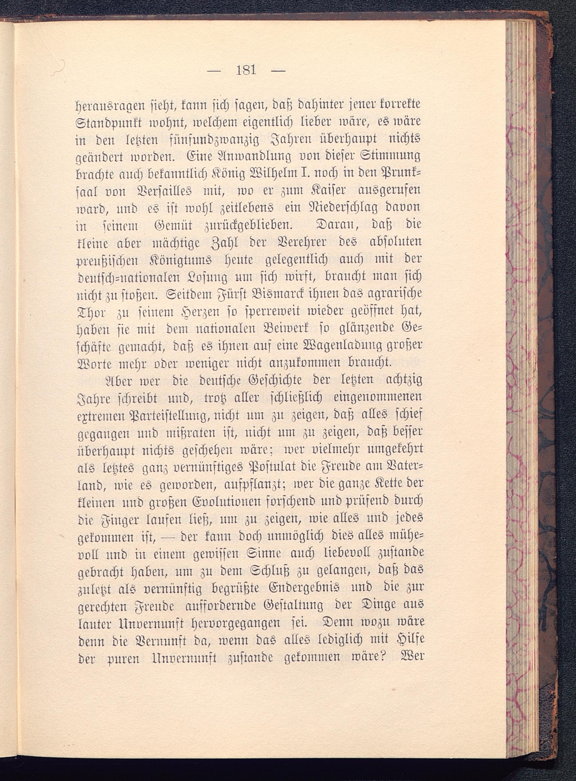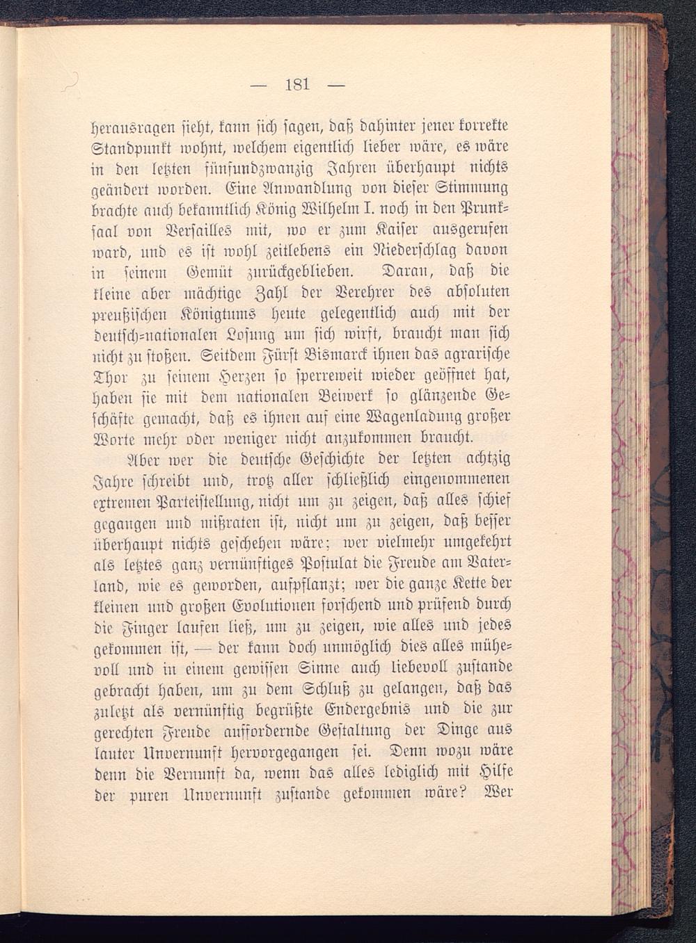Äber wer die deutsche Geschichte der letzten achtzigJahre schreibt und, trotz aller schließlich eingenommenenextremen Parteistellung, uicht um zu zeigen, daß alles schiefgegangen und mißraten ist, nicht um zu zeigen, daß besserüberhaupt nichts geschehen wäre: wer vielmehr umgekehrtals letztes ganz vernünftiges Postulat die Freude am Vater-land, wie es geworden, aufpflanzt; wer die ganze Kette derkleinen nnd großen Evolutionen forschend und prüsend durchdie Finger lausen ließ, um zu zeigen, ivie alles uud jedesgekommen ist, — der kann doch unmöglich dies alles mühe-voll nnd in einem gewissen Sinne mich liebevoll zustandegebracht haben, um zu dem Schluß zu gelangen, daß daszuletzt als vernünftig begrüßte Endergebnis und die zurgerechten Freude auffordernde Gestaltung der Dinge auslauter Unvernunft hervorgegangen sei. Denn wozu wäredenn die Vernunft da, wenn das alles lediglich mit Hilfeder puren Unvernunft zustande gekommen wäre? Wer