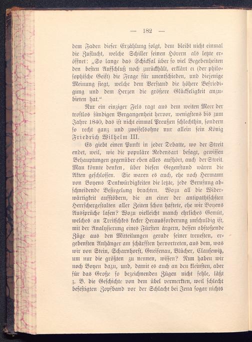 Es giebt einen Punkt in jeder Debatte, wo der Streitendet, weil, wie die populäre Redensart besagt, gewissenBehauptungen gegenüber eben alles aufhört, auch derStreit.Man könnte denken, über diesen Gegenstand wären dieAkten geschlossen. Sie waren es auch, ehe noch Hermannvon Bönens Denkwürdigkeiten die letzte, jede Berufung ab-schneidende Besiegeluug brachten. Wozu all die Wider-wärtigkeit aufstöbern, die an einer der antipathischstenHerrschergestalten aller Zeiten schon haftete, ehe wir BoyensAussprüche lasen? Wozu vielleicht mauch ehrliches Gemüt,welches an Treitschkes kecker Herausforderung unschuldig ist,mit der Analusieruug eines Fürsten ärgern, dessen abstoßendeZüge aus den Mitteilungen gerade seiner trenestcn, er-gebensten Anhänger am schärfsten hervortreten, aus dem, umswir vou Stein, Scharnhorst, Gneisenau, Blücher, Clausewitz ,um uur die größten zu nennen, wissen? Nun haben wirnoch Bönen dazn, uud, damit es anch an den kleinsten, aberfür das Große fo bezeichnenden Zügen nicht fehle, läßtz. B. die Geschichte von dem übel vermerkten, weil schlechtbefestigten Zopfband vor der Schlacht bei Jena sogar nichts