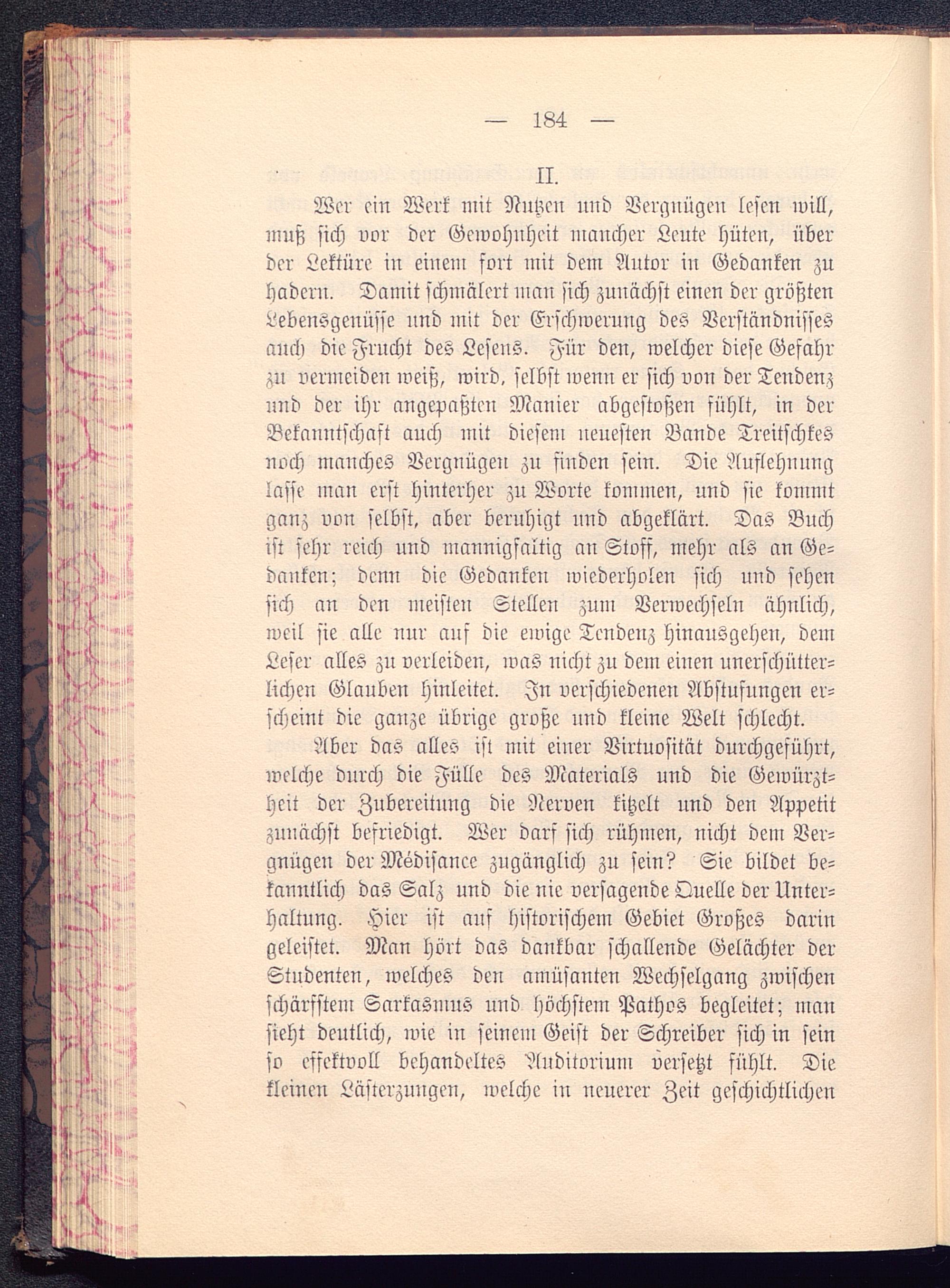 Wer ein Werk mit Nutzen nnd Vergnügen lesen will,muß sich vor der Gewohnheit mancher Leute hüten, überder Lektüre iu eiuem fort mit dein Autor in Gedanken zuhadern. Damit schmälert mau sich zunächst einen der größtenLebensgenüsse nnd mit der Erschwerung des Verständnissesauch die Frucht des Lesens. Für den, welcher diese Gefahrzu vermeiden weiß, wird, selbst wenn er sich von der Tendenzund der ihr angepaßten Manier abgestoßen fühlt, in derBekanntschaft auch mit diesem neuesten Bande Treitschtesnoch manches Verguügeu zu finden sein. Die Auflehnunglasse man erst hinterher zu Worte kommen, und sie kommtganz von selbst, aber beruhigt uud abgeklärt. Das Buchist sehr reich und mannigfaltig an Stoff, mehr als an Ge-danken; deun die Gedanken wiederholen sich uud sehensich an den meisten Stellen zum Verwechseln ähnlich,weil sie alle nur auf die einige Tendenz hinausgehen, demLeser alles zu verleiden, was nicht zu dem eiuen unerschütter-lichen Glauben hinleitet. In verschiedenen Abstufungen er-scheint die ganze übrige große und kleine Welt schlecht.