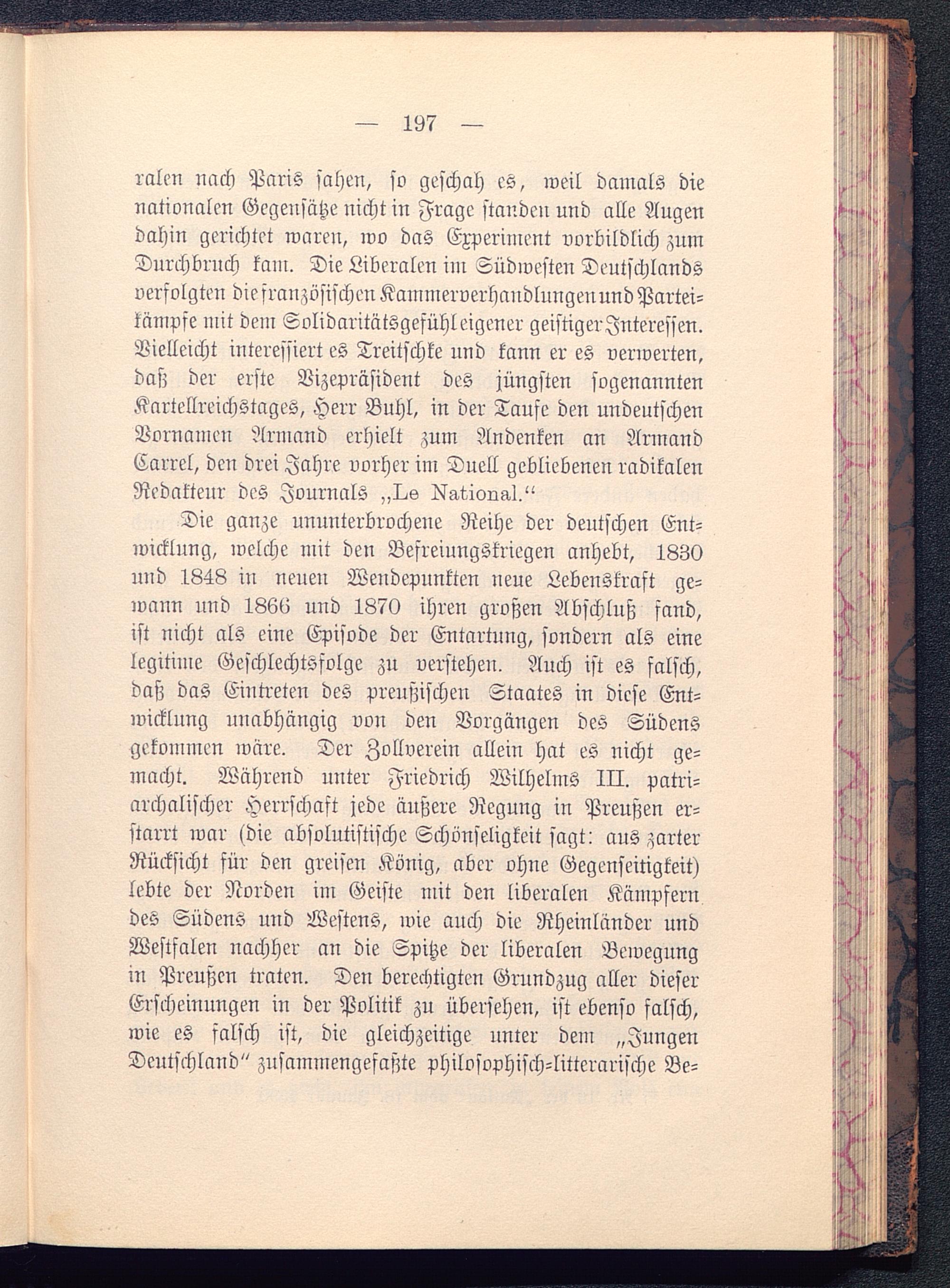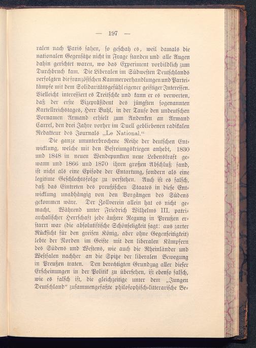 raten nach Paris sahen, so geschah es, weil damals dienationalen Gegensätze nicht in Frage standen und alle Augendahin gerichtet waren, wo das Experiment vorbildlich zumDnrchbruch kam. Die Liberalen im Südwesten Deutschlands verfolgten die smnzösischen Kammerverhandlungen und Partei-tämpfe mit dem Solidaritätsgefühleigener geistiger Interessen.Vielleicht interessiert es Treitschte und kann er es verwerten,das; der erste Vizepräsident des jüngsten sogenanntenKartellreichstages, Herr Buhl, in der Taufe den undeutschenVornamen Armand erhielt zum Andenken an ArmandCarrel, deu drei Jahre vorher im Duell gebliebenen radikalenRedakteur des Journals „I^s Natiorig,!."