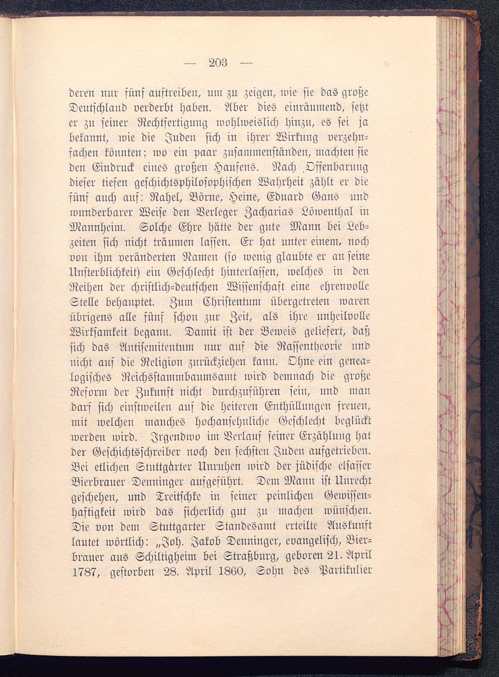 deren nur fünf auftreiben, um zu zeigen, wie sie das großeDeutschland verderbt haben. Aber dies einräumend, setzter zn seiner Rechtfertigung wohlweislich hinzu, es sei jabekannt, wie die Juden sich in ihrer Wirkung verzehn-fachen tonnten; wo ein paar zusammeustäuden, machten sieden Eindruck eiucs großen Hanfens. Nach .Offenbarungdieser tiefen geschichtsphilosophischen Wahrheit zählt er diefüns anch ans: Rahel, Börne, Heine, Eduard Gans undwunderbarer Weise den Verleger Zacharias Löwenthal inMannheim . Solche Ehre hätte der ante Mann bei Leb-zeiten sich nicht träumen lassen. Er hat unter einem, nochvon ihm veränderten Namen (so wenig glaubte er an seineUnsterblichkeit) ein Geschlecht hinterlassen, welches in denReihen der christlich-deutschen Wissenschaft eine ehrenvolleStelle behauptet. Zum Christentum übergetreten warenübrigens alle fünf schon zur Zeit, als ihre unheilvolleWirksamkeit begann. Damit ist der Beweis geliefert, daßsich das Antisemitentnm nur auf die Rassenthrorie nndnicht auf die Religiou zurückziehen kann. Ohne ein genea-logisches Reichsstammbaumsamt wird demnach die großeReform der Zukunft uicht durchzuführen sein, und mandarf sich einstweilen ans die heiteren Enthüllungen freuen,mit welchen manches hochansehnliche Geschlecht beglücktwerdeil wird. Irgendwo im Verlauf seiner Erzählung hatder Geschichtsschreiber noch deu sechsten Juden ausgetrieben.Bei etlichen Stuttgarter Unruhen wird der jüdische elsasserBierbrauer Denninger aufgeführt. Dem Maun ist Unrechtgeschehen, und Treitschke in seiner peinlichen Gewissen-haftigkeit wird das sicherlich gut zu machen wünschen.Die von dem Stuttgarter Standesamt erteilte Auskunftlantet wörtlich: „Joh. Jakob Denninger, evangelisch, Bier-brauer aus Schiltigheim bei Straßburg , geboren 21. April1787, gestorben 28. April 1860, Sohn des Partiknlier
