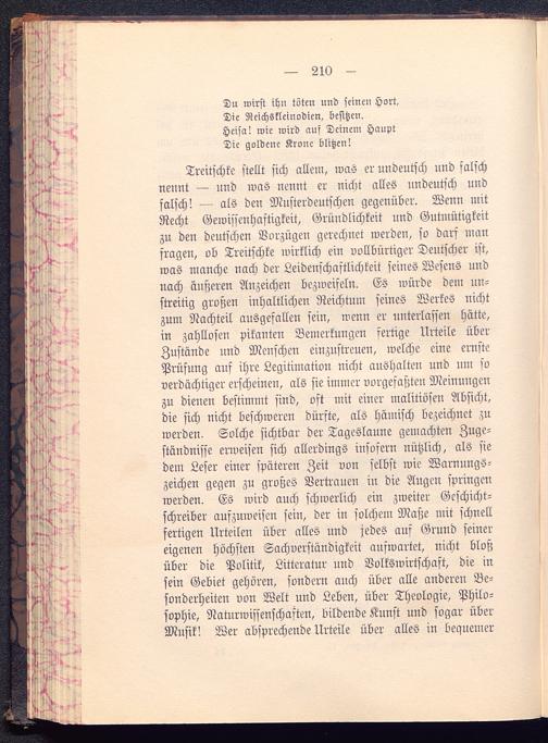 Treitschke stellt sich allem, was er undeutsch und falschneunt — und was nennt er nicht alles undeutsch undfalsch! — als den Musterdeutschen gegenüber. Wenn mitRecht Gewissenhaftigkeit, Gründlichkeit und Gutmütigkeitzu deu deutschen Vorzügen gerechnet werden, so dars manfragen, ob Treitschke wirklich ein vollbürtiger Deutscher ist,was manche nach der Leidenschaftlichkeit seines Wesens undnach äußeren Anzeichen bezweifeln. Es würde dem un-streitig großen inhaltlichen Reichtum seines Werkes nichtzum Nachteil ausgefallen sein, wenn er unterlassen hätte,in zahllosen pikanten Bemerkungen fertige Urteile überZustände und Menschen einzustreuen, welche eine ernstePrüfung auf ihre Legitimation nicht aushalten und um soverdächtiger erscheinen, als sie immer vorgefaßten Meinuugeuzu dienen bestimmt sind, oft mit einer malitiöseu Absicht,die sich nicht beschweren dürfte, als hämisch bezeichnet zuwerden. Solche sichtbar der Tageslaune gemachten Zuge-ständnisse erweisen sich allerdings insofern nützlich, als siedem Leser einer späteren Zeit von selbst wie Warnungs-zeichen gegen zu großes Vertrauen in die Augeu springenwerden. Es wird auch schwerlich ein zweiter Geschicht-schreiber aufzuweisen sein, der in solchem Maße mit schnellfertigen Urteilen über alles und jedes auf Grund seinereigenen höchsten Sachverständigkeit aufwartet, nicht bloßüber die Politik, Litteratur und Volkswirtschaft, die insein Gebiet gehören, sondern auch über alle anderen Be-sonderheiten von Welt uud Lebeu, über Theologie, Philo-sophie, Naturwissenschaften, bildende Kunst und sogar überMusik! Wer absprechende Urteile über alles in bequemer