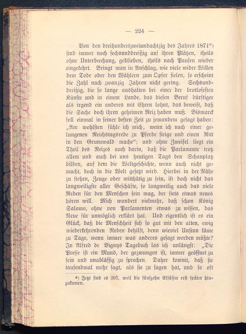 Von den dreihnndertzweiundachtzig des Jahres 1871'-)sind immer noch sechsunddreißig auf ihren Plätzen, theilsohne Unterbrechung, geblieben, theils nach Pausen wiedereingekehrt. Bringt man in Anschlag, wie viele wider Willendem Tode oder den Wählern zum Opfer fielen, so erscheintdie Zahl nach zwanzig Jahren nicht gering. Sechsund-dreißig, die so lange aushalten bei einer der brotlosestenKünste und in einem Lande, das diesen Beruf dürftigerals irgend ein anderes mit Ehren lohnt, das beweist, daßdie Sache doch ihren geheimen Reiz haben muß. Bismarcksoll einmal in seiner besten Zeit zu jemandem gesagt Habens„Am wohlsten fühle ich mich, wenn ich nach einer ge-lungenen Reichstagsrede zu Pferde steige und einen Rittin den Grunewald mache"; und ohne Zweifel liegt einTheil des Reizes auch darin, daß die Parlamente trotzallem und auch bei uns heutigen Tags den Schauplatzbilden, auf deni die Weltgeschichte, wenn auch nicht ge-macht, doch in die Welt gesetzt wird. Hierbei in der Nähezu stehen, Zeuge oder mitthätig zu sein, ist doch nicht daslangweiligste aller Geschäfte, so langweilig auch das vieleReden für den Menschen sein mag, der stets etwas neueshören will. Mich wundert vielmehr, daß schon KönigSalomo , ohne von Parlamenten etwas zu wissen, dasNeue für unmöglich erklärt hat. Und eigentlich ist es einGlück, daß die Menschheit sich so gut mit den alten, eivigwiederkehrenden Reden behilft, denn wieviel Unsinn kämezu Tage, wenn immer was anderes gesagt werden müßte?In Alfred de Vignys Tagebuch las ich unlängst' „DiePresse ist ein Mund, der gezwungen ist, immer geöffnet zusein nnd unablässig zu sprechen. Daher kommt, daß sietausendmal mehr sagt, als sie zu sagen hat, und so oft