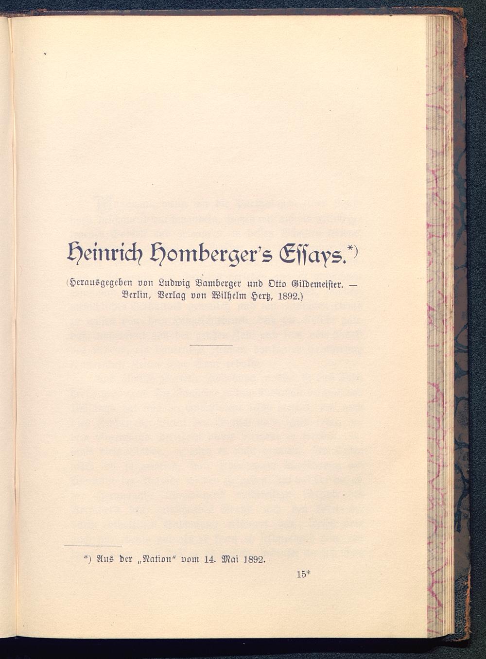 Heinrich Hombergens Lssays.^iHerausgegeben von Ludwig Bambcrgcr und Otto Gildcmeister. —Berlin, Verlag von Wilhelm Hertz , 1892.)Ans der „Nation " vom 14. Mai 1892.