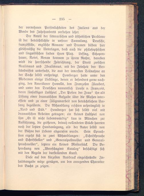 Der Anteil der litterarischen und ästhetischen Problemeist der beträchtlichste in unserer Sammlung. Deutsche,französische, englische Romane und Dramen bilden hiergleichmäßig die Unterlagen, doch anch die philosophischenund linguistischen finden ihren Platz. Lessing, Schopen-hauer , Noirs, Renan kommen zu ihrem Rechte, danebenwird die herrschende Zeitrichtung, der Streit zwischenRealismus und Idealismus, mit der Feinheit des Ver-ständnisses untersucht, die aus der innersten Teilnahme ander Sache selbst entspringt. Homberger hatte unter denModernen einige Lieblinge, denen er besonders gerne nach-ging, den Amerikaner Howells, den Franzosen Flanbert,und unter den Deutschen namentlich Louise v. Franvois,deren sünfaktiges Lustspiel „Der Posten der Frau" ihn alsLösnng einer dramatischen Aufgabe über die Maßen inter-essirte und zu einer Filigranarbeit non beträchtlichem Um-fang begeisterte. Die Abhandlung erschien ursprünglich in„Nord uud Süd." Homberger hat sich selbst viel mitdramatischen Arbeiten getragen; ein kleines Lustspiel vonihm „Er ist nicht liebenswürdig" kam in München zurAusführung, die größeren, beinah vollendeten Stücke harrtennoch der letzten Handanlegung, als der Autor selbst vouder Bühne des Lebens abgerufen wurde. Sein Sprach-sinn ergeht sich in zwei Abhandlungen' „Schriftspracheund Schriftsteller" und „Generalpostmeister und General-sprachmeister", letztere ein kleines Meisterstück. Die Be-sprechung von „Wereschagins Katalog" beschäftigt sichmit den Regeln der darstellenden Kunst.