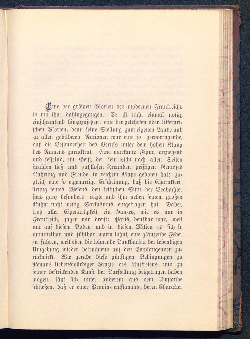 Mine der größten Glorien des modernen Frankreichs ist mit ihm dahingegangen. Es ist nicht einmal nötig,einschränkend hinzuzusetzen! eine der gelehrten oder litterari-schen Glorien, denn seine Stellung zum eigenen Lande undzu allen gebildeten Nationen war eine so hervorragende,daß die Besonderheit des Berufs unter dem hohen Klangdes Namens zurücktrat. Eiue markante Figur, anziehendund fesselnd, ein Geist, der sein Licht nach allen Seitenstrahlen ließ und zahllosen Freunden geistigen GenussesNahrung und Freude in reichem Maße geboten hat; zu-gleich eine so eigenartige Erscheinung, daß die Charakteri-sirung seines Wesens den kritischen Sinn der Beobachterstets ganz besonders reizte und ihm neben seinem großenRuhm nicht wenig Sarkasmus eingetragen hat. Dabei,trotz aller Eigenartigkeit, ein Ganzes, wie es nur inFrankreich, sagen wir dreist: Paris , denkbar war, weilnur auf diesein Boden und in diesem Milieu es sich sounmittelbar und fühlbar warm lohnt, eine glänzende Federzu führen, weil eben die lohnende Dankbarkeit der lebendigenUmgebung wieder befruchtend auf den Empfangenden zu-rückwirkt. Wie gerade diese günstigen Bedingungen znRenans liebenswürdiger Grazie des Auftretens und zuseiner bestrickenden Kunst der Darstellung beigetragen habenmögen, läßt sich unter anderem aus dem Umständeschließen, daß er einer Provinz entstammte, deren Charakter