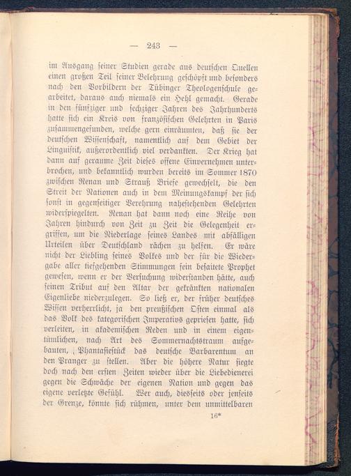 im Ausgang seiner Studien gerade aus deutschen Quelleneinen großen Teil seiner Belehrung geschöpft uud besondersnach den Vorbildern der Tübinger Theologenschule ge-arbeitet, daraus auch niemals ein Hehl gemacht. Geradein den fünfziger und sechziger Jahren des Jahrhundertshatte sich ein Kreis von französischen Gelehrten in Paris zusammengesuuden, welche gern einräumten, daß sie derdeutschen Wissenschaft, namentlich auf dem Gebiet derLinguistik, außerordentlich viel verdankten. Der Krieg hatdann auf geraume Zeit dieses offene Einvernehmen unter-brochen, und bekanntlich wurden bereits im Sommer 1870zwischen Renan und Strauß Briefe gewechselt, die denStreit der Nationen auch in dem Meinungskampf der sichsonst in gegenseitiger Verehrung nahestehenden Gelehrtenwiderspiegelten. Renan hat dann noch eine Reihe vonJahren hindurch von Zeit zu Zeit die Gelegenheit er-griffen, um die Niederlage seines Landes mit abfälligenUrteilen über Deutschland rächen zu helfen. Er wärenicht der Liebling seines Volkes und der für die Wieder-gabe aller tiefgehenden Stimmungen fein besaitete Prophetgewesen, wenn er der Versuchung widerstanden hätte, auchseinen Tribut auf den Altar der gekränkten nationalenEigenliebe niederzulegen. So ließ er, der früher deutschesWissen verherrlicht, ja den preußischen Osten einmal alsdas Volk des kategorischen Imperativs gepriesen hatte, sichverleiten, in akademischen Reden und in einem eigen-tümlichen, nach Art des Sommernachtstraum aufge-bauten, , Phantasiestück das deutsche Barbarentum anden Pranger zu stellen. Aber die höhere Natur siegtedoch nach den ersten Zeiten wieder über die Liebedienereigegen die Schwäche der eigenen Nation und gegen daseigene verletzte Gefühl. Wer auch, diesseits oder jenseitsder Grenze, könnte sich rühmen, unter dem unmittelbaren