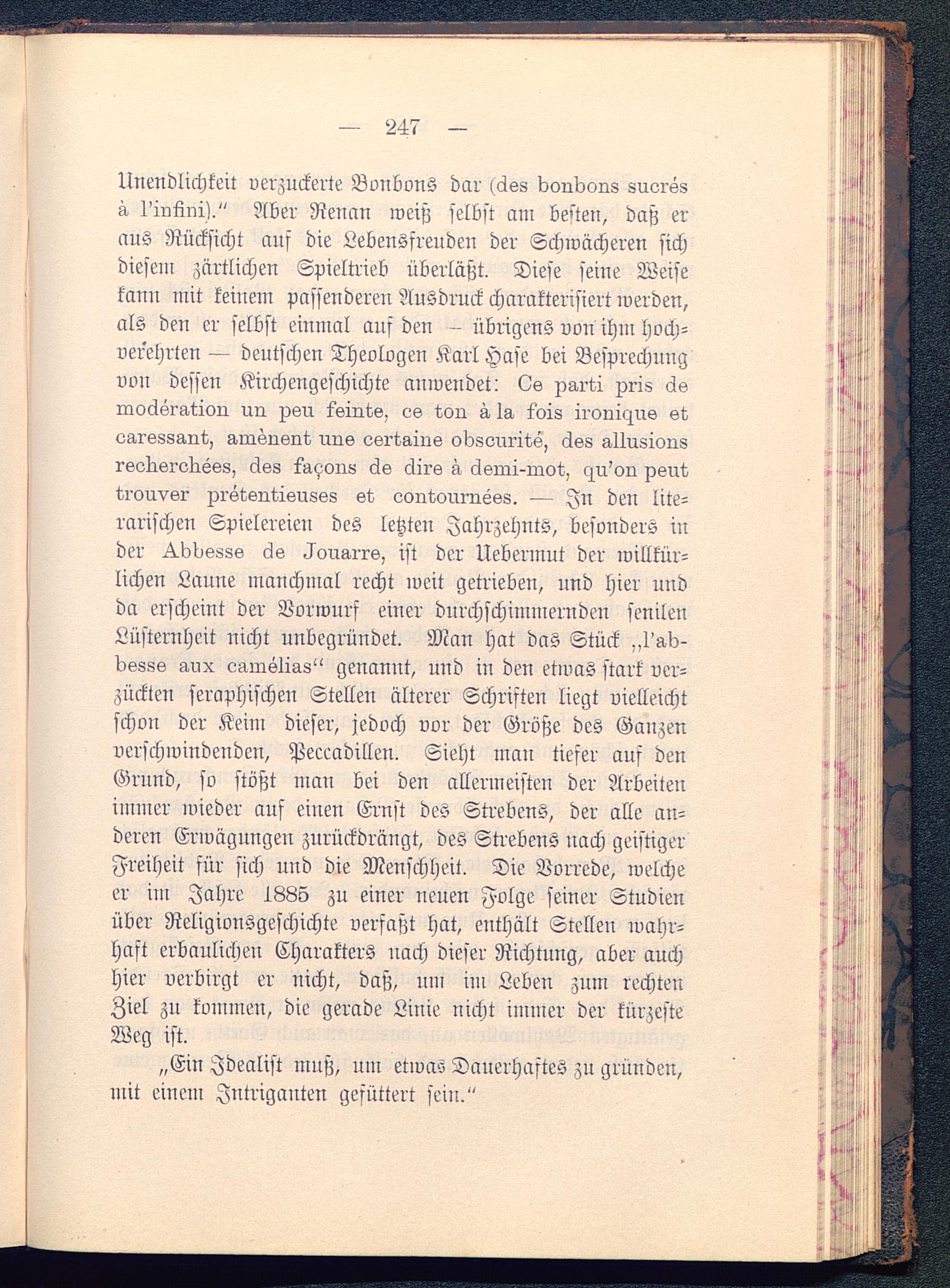 Unendlichkeit verzuckerte Bonbons dar (äs8 bov.dov.8 suorsZs. 1'intini)." Aber Renan weiß selbst am besten, daß eraus Rücksicht aus die Lebensfrenden der Schwächeren sichdiesem zärtlichen Spieltrieb überläßt. Diese seine Weisekann mit keinem passenderen Ausdruck charakterisiert werden,als den er selbst einmal auf den - übrigens von ihm hoch-verehrten — deutschen Theologen Karl Hase bei Besprechungvon dessen Kirchengeschichte anwendet! Ls xs.rti xris 6snuzäki-Atiou. un psu tsints, es tou. s, Is. t'ois irouic^us stLS.rk88S.rit., s-msusirt uns osrtaius c>d8ourits, ckss Äl1usion8rsczo.sroo.ss8, cl«8 kseoirs cks ciirs s ctsn^i-rnot, c^rr'vQ psuttrouvsr ^rstsv.tisn8S8 st sc>irtourirss8. — In den lite-rarischen Spielereien des letzten Jahrzehnts, besonders inder ^.bds88s 6s ^ousrrs, ist der Uebermut der willkür-lichen Laune manchmal recht weit getrieben, und hier undda erscheint der Vorwurf einer durchschimmernden senilenLüsternheit nicht unbegründet. Man hat das Stück ,,1's.d-ds8ss emx ssllislis8" genannt, und in den etwas stark ver-zückten seraphischen Stellen älterer Schriften liegt vielleichtschon der Keim dieser, jedoch vor der Größe des Ganzenverschwindenden, Peccadillen. Sieht man tiefer auf denGrund, so stößt man bei den allermeisten der Arbeitenimmer wieder auf einen Ernst des Strebens, der alle an-deren Erwägungen zurückdrängt, des Strebens nach geistigerFreiheit für sich und die Menschheit. Die Vorrede, welcheer im Jahre 1885 zu einer neuen Folge seiner Studienüber Religionsgeschichte verfaßt hat, enthält Stellen wabr-haft erbaulichen Charakters nach dieser Richtung, aber auchhier verbirgt er nicht, daß, nm im Leben zum rechtenZiel zu kommen, die gerade Linie nicht immer der kürzesteWeg ist.