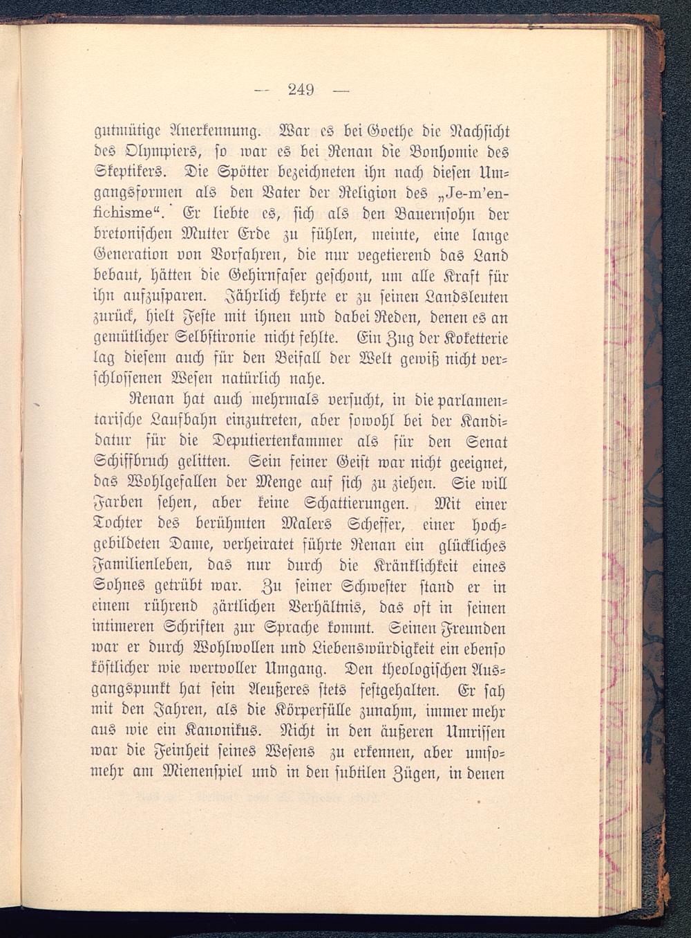 Renan hat auch mehrmals versucht, in die parlamen-tarische Laufbahn einzutreten, aber sowohl bei der Kandi-datur für die Deputiertenkammer als für den SenatSchiffbruch gelitten. Sein feiner Geist war nicht geeignet,das Wohlgefallen der Menge auf sich zu ziehen. Sie willFarben sehen, aber keine Schattierungen. Mit einerTochter des berühmten Malers Scheffer, einer hoch-gebildeten Dame, verheiratet führte Renan ein glücklichesFamilienleben, das nur durch die Kränklichkeit einesSohnes getrübt war. Zu seiner Schwester stand er ineinem rührend zärtlichen Verhältnis, das oft in seinenintimeren Schriften zur Sprache kommt. Seinen Freundenwar er durch Wohlwollen und Liebenswürdigkeit ein ebensoköstlicher wie wertvoller Umgang. Den theologischen Aus-gangspunkt hat sein Aeußeres stets festgehalten. Er sahmit den Jahren, als die Körperfülle zunahm, immer mehraus wie ein Kanonikus. Nicht in den äußeren Umrisfenwar die Feinheit seines Wesens zu erkennen, aber umso-mehr am Mienenspiel und in den subtilen Zügen, in denen