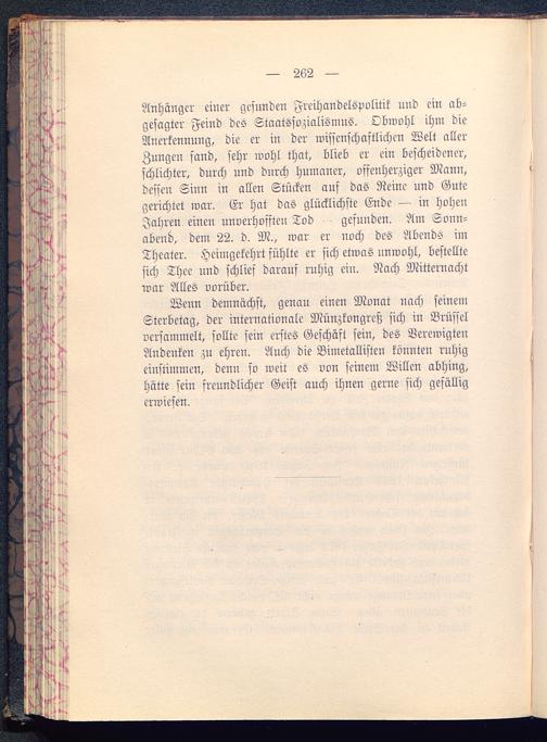 Wenn demnächst, genau einen Monat nach seinemSterbetag, der internationale Münzkongreß sich in Brüssel versammelt, sollte sein erstes Geschäft sein, des VerewigtenAndenken zu ehren. Auch die Bimetallisten könnten ruhigeinstimmen, denn so weit es von seinem Willen abhing,hätte sein freundlicher Geist auch ihnen gerne sich gefälligerwiesen.