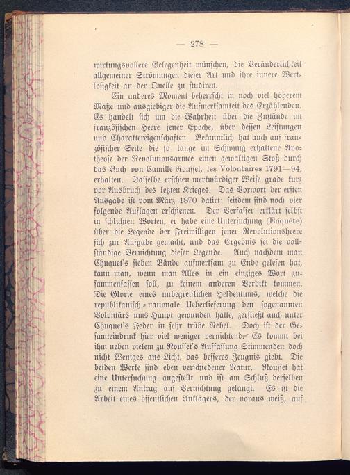 Ein anderes Moment beherrscht in noch viel höheremMaße und ausgiebiger die Aufmerksamkeit des Erzählenden.Es handelt sich um die Wahrheit über die Zustände imfranzösischen Heere jener Epoche, über dessen Leistungenund Charaktereigenschaften. Bekanntlich hat auch auf fran-zösischer Seite die so lange im Schwung erhaltene Apo-theose der Revolutiousarmee einen gewaltigen Stoß durchdas Buch von Camille Rousset , leg VolvQtairs8 1791—94,erhalten. Dasselbe erschien merkwürdiger Weise grade kurzvor Ausbruch des letzten Krieges. Das Vorwort der erstenAusgabe ist vom März 1870 datirt; seitdem sind noch vierfolgende Auflagen erschienen. Der Verfasser erklärt selbstin schlichten Worten, er habe eine Untersuchung (Iilri^ustö)über die Legende der Freiwilligen jener Revolutionsheeresich zur Ausgabe gemacht, und das Ergebnis sei die voll-ständige Vernichtung dieser Legende. Auch nachdem manChuquet's sieben Bände aufmerksam zu Ende gelesen hat,kann man, wenn man Alles in ein einziges Wort zu-sammenfassen soll, zu keinem anderen Verdikt kommen.Die Glorie eines unbegreiflichen Heldentums, welche dierepublikanisch - nationale Ueberlieferuug den sogenanntenVolontärs ums Haupt gewunden hatte, zerfließt auch unterChuquet's Feder in sehr trübe Nebel. Doch ist der Ge-samteindruck hier viel weniger vernichtend."' Es kommt beiihm neben vielem zu Rousset's Auffassung Stimmenden dochnicht Weniges ans Licht, das besseres Zeugnis giebt. Diebeiden Werke sind eben verschiedener Natur. Rousset hateine Untersuchung angestellt und ist am Schluß derselbenzu einem Antrag auf Vernichtuug gelangt. Es ist dieArbeit eines öffentlichen Anklägers, der voraus weiß, auf