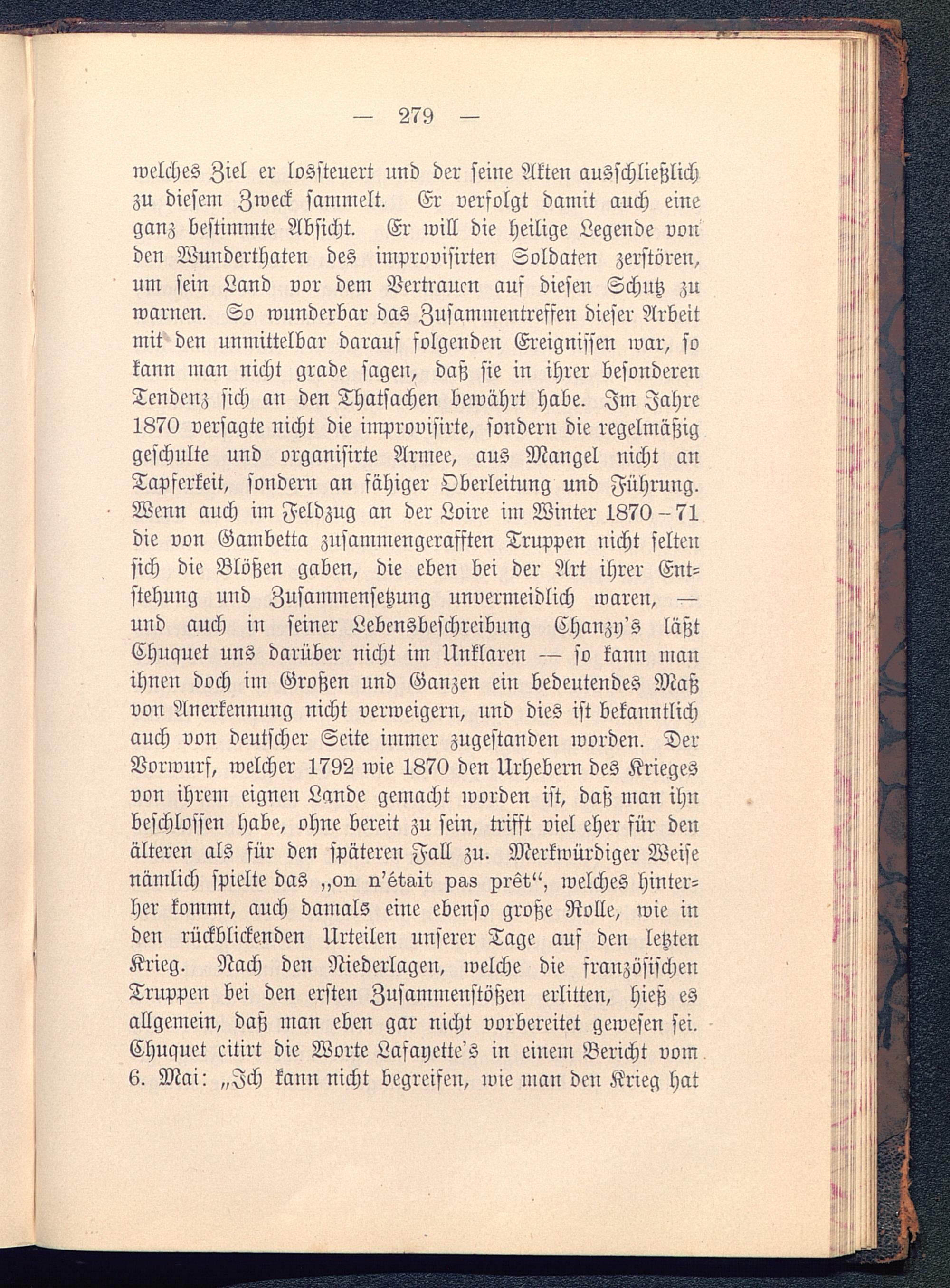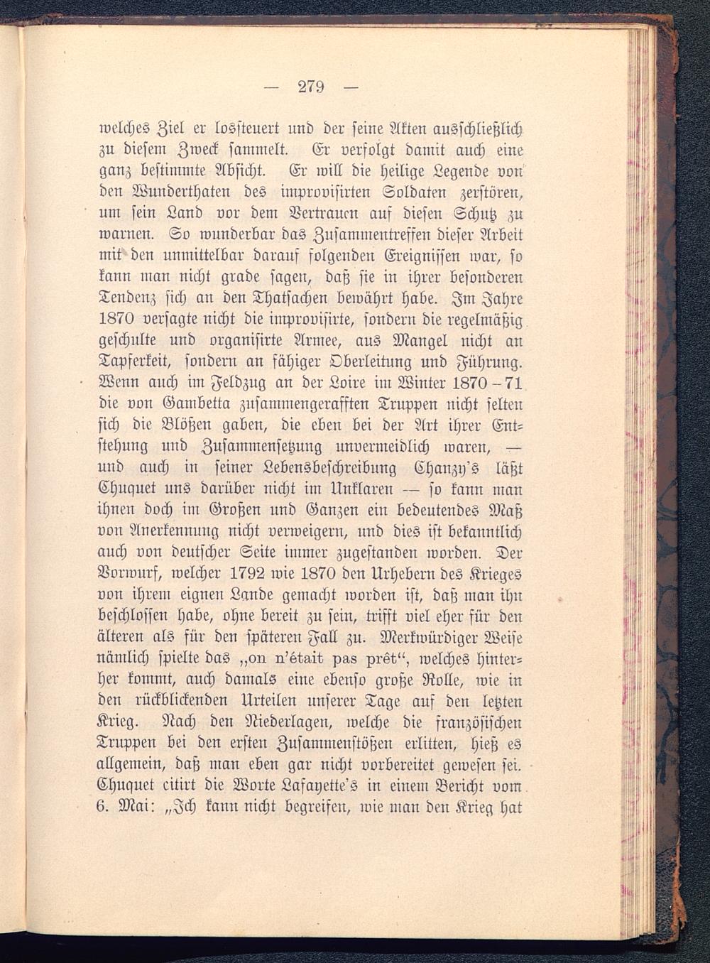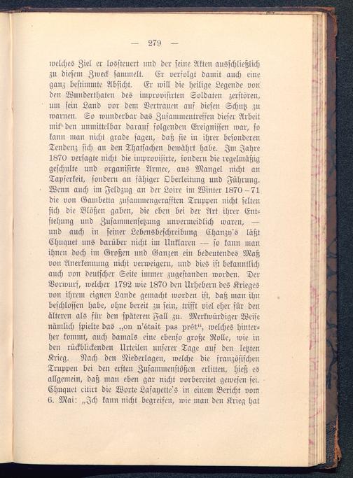 welches Ziel er lossteuert und der seine Akten ausschließlichzu diesem Zweck sammelt. Er verfolgt damit auch eineganz bestimmte Absicht. Er will die heilige Legende vonden Wunderthaten des imprvvisirten Soldaten zerstören,um sein Land vor dem Vertrauen auf diesen Schutz zuwarnen. So wunderbar das Zusammentreffen dieser Arbeitmit den unmittelbar darauf folgenden Ereignisfen war, sokann man nicht grade sagen, daß sie in ihrer besonderenTendenz sich an den Thatsachen bewährt habe. Im Jahre1870 versagte nicht die improvisirte, sondern die regelmäßiggeschulte und organisirte Armee, aus Mangel nicht anTapferkeit, sondern an fähiger Oberleitung und Fuhrung.Wenn auch im Feldzug an der Loire im Winter 1870 - 71die von Gambetta zusammengerafften Truppen nicht seltensich die Blößen gaben, die eben bei der Art ihrer Ent-stehung und Zusammensetzung unvermeidlich waren, —und auch in seiner Lebensbeschreibung Chanzn's läßtChuquet uns darüber nicht im Unklaren — so kann manihnen doch im Großen und Ganzen ein bedeutendes Maßvon Anerkennung nicht verweigern, nnd dies ist bekanntlichauch von deutscher Seite immer zugestanden worden. DerVorwurf, welcher 1792 wie 1870 den Urhebern des Kriegesvon ihrem eignen Lande gemacht worden ist, daß man ihnbeschlossen habe, ohne bereit zu sein, trifft viel eher für denälteren als für den späteren Fall zu. Merkwürdiger Weisenämlich spielte das „on n'stait ps.s xret". welches hinter-her kommt, auch damals eine ebenso große Rolle, wie inden rückblickenden Urteilen unserer Tage auf den letztenKrieg. Nach den Niederlagen, welche die französischenTruppen bei den ersten Zusammenstößen erlitten, hieß esallgemein, daß man eben gar nicht vorbereitet gewesen sei.Chuauet citirt die Worte Lafauette's in einem Bericht vom6. Mai! „Ich kann nicht begreifen, wie man den Krieg hat