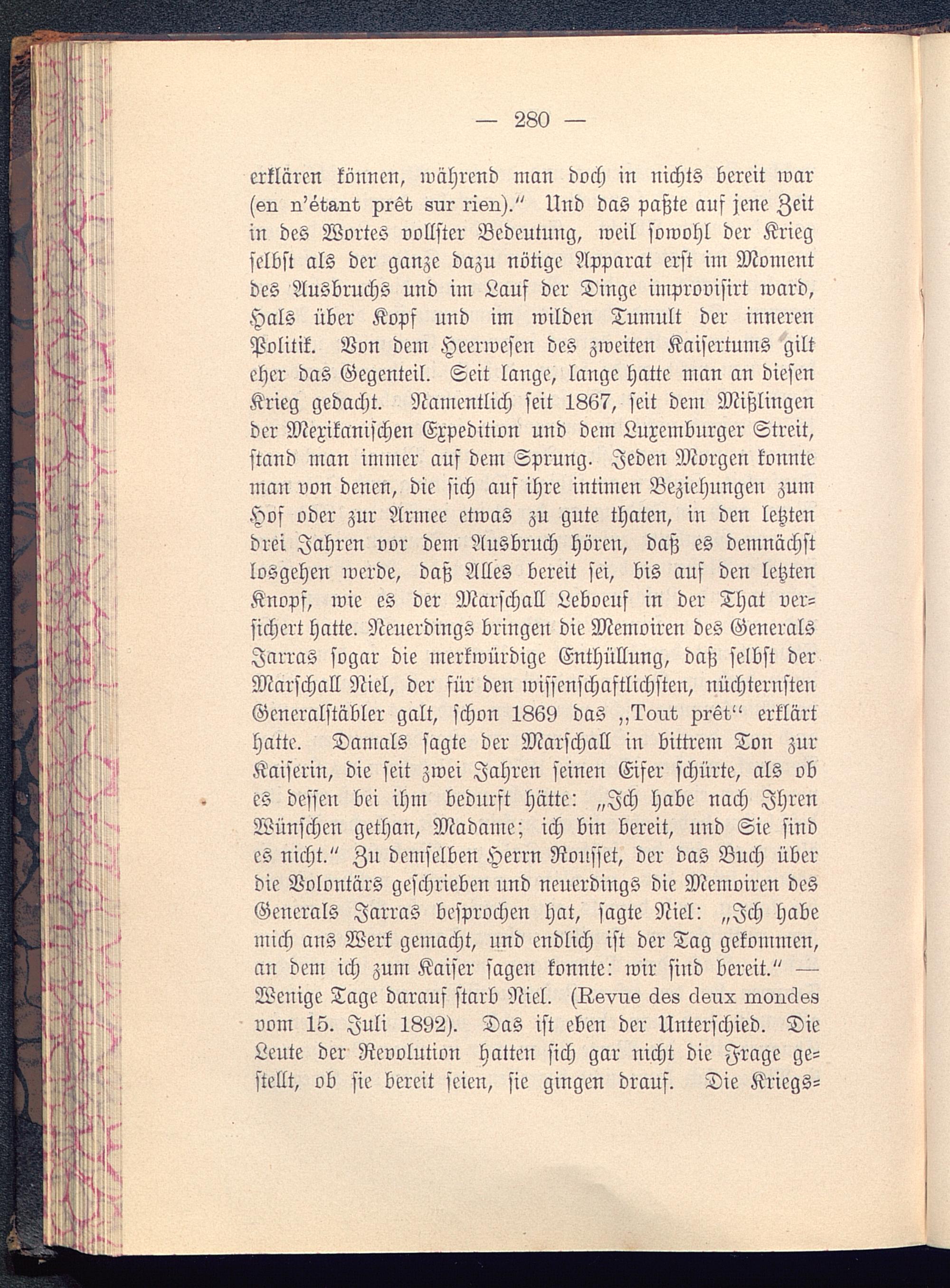 erklären können, während man doch in nichts bereit warssn n'stMt xrst) sur risu)." Und das paßte auf jene Zeitin des Wortes vollster Bedeutung, weil sowohl der Kriegselbst als der ganze dazu nötige Apparat erst im Momentdes Ausbruchs und im Laus der Dinge improvisirt ward,Hals über Kopf und im wilden Tumult der innerenPolitik. Von dem Heerwesen des zweiten Kaisertums gilteher das Gegenteil. Seit lange, lange hatte man an diesenKrieg gedacht. Namentlich seit 1867, seit dem Mißlingender Mexikanischen Expedition und dem Luxemburger Streit,stand man immer aus dem Sprung. Jeden Morgen konnteman von denen, die sich auf ihre intimen Beziehungen zumHof oder zur Armee etwas zu gute thaten, in den letztendrei Jahren vor dem Ausbruch hören, daß es demnächstlosgehen werde, daß Alles bereit sei, bis auf den letztenKnopf, wie es der Marschall Leboeuf in der That ver-sichert hatte. Neuerdings bringen die Memoiren des GeneralsJarras sogar die merkwürdige Enthüllung, daß selbst derMarschall Niel, der für den wissenschaftlichsten, nüchternstenGeneralstäbler galt, schon 1369 das „?ont prst" erklärthatte. Damals sagte der Marschall in bittrem Ton zurKaiserin, die seit zwei Jahren seinen Eifer schürte, als obes dessen bei ihm bedurft hätte: „Ich habe nach IhrenWünschen gethan, Madame; ich bin bereit, und Sie sindes nicht." Zu demselben Herrn Rousset, der das Buch überdie Volontärs geschrieben und neuerdings die Memoiren desGenerals Jarras besprochen hat, sagte Niel: „Ich habemich ans Werk gemacht, und endlich ist der Tag gekommen,an dem ich zum Kaiser sagen konnte: wir sind bereit." —Wenige Tage darauf starb Niel. sRsvus äss äsrrx raonclssvom 15. Juli 1892). Das ist eben der Unterschied. DieLeute der Revolution hatten sich gar nicht die Frage ge-stellt, ob sie bereit seien, sie gingen draus. Die Kriegs-
