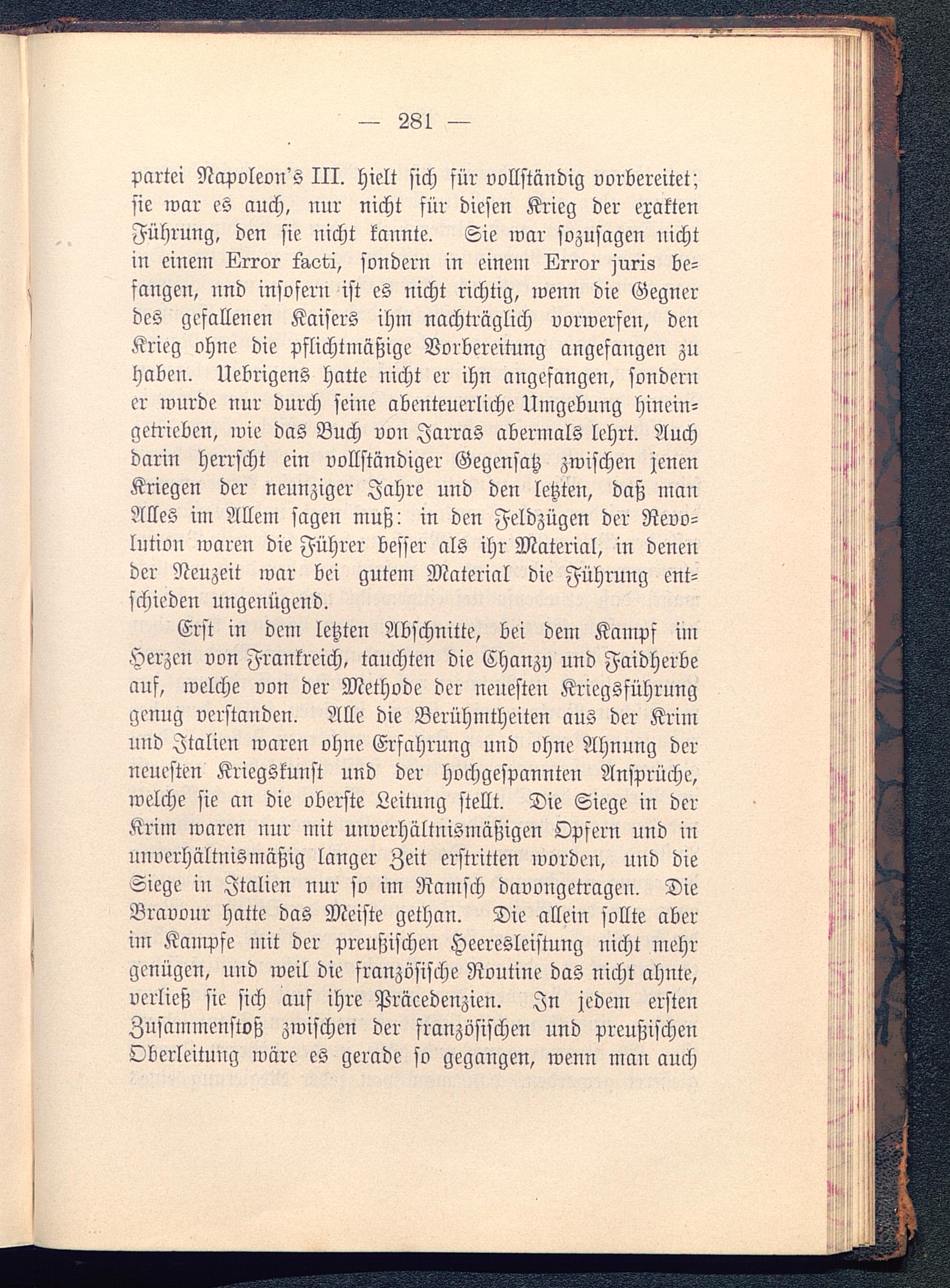 Partei Napoleon's III. hielt sich für vollständig vorbereitet;sie war es auch, nur nicht für diesen Krieg der exaktenFührung, den sie nicht kannte. Sie war sozusagen uichtin einem lÄror raot-i, sondern in einein lZrror juris be-fangen, nnd insofern ist es nicht richtig, wenn die Gegnerdes gefallenen Kaisers ihm nachträglich vorwerfen, denKrieg ohne die pflichtmäßige Vorbereitung angefaugen zuhabeu. Uebrigens hatte nicht er ihn angefangen, sonderner wurde nur durch seine abenteuerliche Umgebung hinein-getrieben, wie das Buch von Jarras abermals lehrt. Auchdarin herrscht ein vollständiger Gegensatz zwischen jenenKriegen der neunziger Jahre und den letzten, daß manAlles im Allem sagen muß: in den Feldzügen der Revo-lution waren die Führer besser als ihr Material, in denender Neuzeit war bei gutem Material die Führung ent-schieden ungenügend.