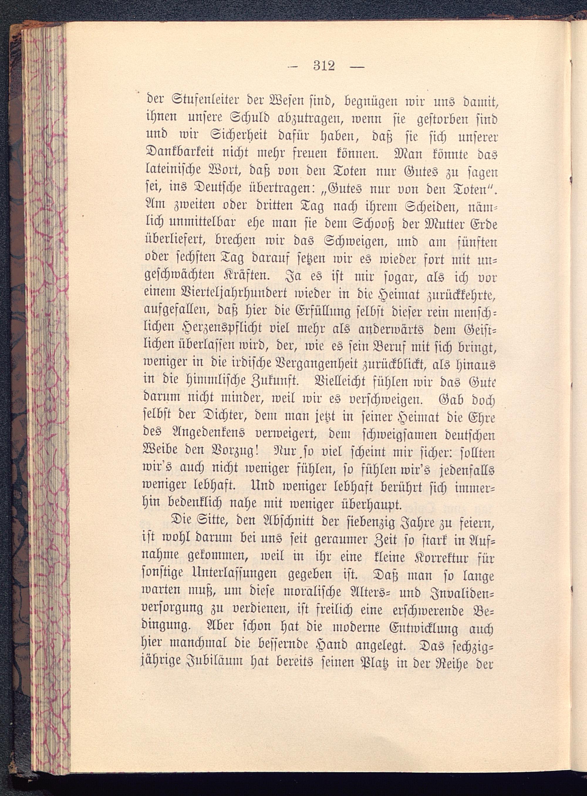 der Stufenleiter der Wesen sind, begnügen wir uns damit,ihnen unsere Schuld abzutragen, wenn sie gestorben sindund wir Sicherheit dafür haben, daß sie sich unsererDankbarkeit nicht mehr freuen können. Man könnte daslateinische Wort, daß von den Toten nur Gutes zu sagensei, ins Deutsche übertragen' „Gutes nur von den Toten".Am zweiten oder dritten Tag nach ihrem Scheiden, näm-lich unmittelbar ehe man sie deni Schooß der Mutter Erdeüberliefert, brechen wir das Schweigen, und am fünftenoder sechsten Tag darauf setzen wir es wieder fort mit un-geschwächten Kräften. Ja es ist mir sogar, als ich voreinem Vierteljahrhundert wieder in die Heimat zurückkehrte,aufgefalleu, daß hier die Erfüllung selbst dieser rein mensch-lichen Herzenspslicht viel mehr als anderivärts dem Geist-lichen überlassen wird, der, wie es sein Berus mit sich bringt,weniger in die irdische Vergangenheit zurückblickt, als hinausin die himmlische Zukuuft. Vielleicht fühlen wir das Gutedarum nicht minder, weil wir es verschweigen. Gab dochselbst der Dichter, dem man jetzt in seiner Heimat die Ehredes Angedenkens verweigert, dem schweigsamen deutschenWeibe den Vorzug! Nur.so viel scheint mir sicher: solltenwir's auch nicht weniger fühlen, so fühlen wir's jedenfallsweniger lebhaft. Und weniger lebhaft berührt sich immer-hin bedenklich nahe mit weniger überhaupt.