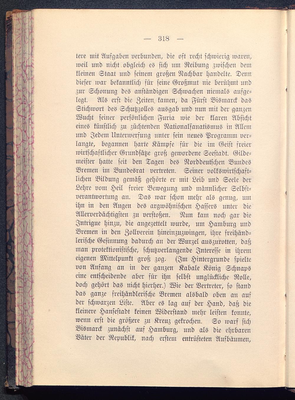 tere mit Aufgaben verbunden, die oft recht schwierig wareu,weil und nicht obgleich es sich nm Reibung zwischen demkleinen Staat und seinem großen Nachbar handelte. Denndieser war bekanntlich für seine Großmut nie berühmt undzur Schonung des anständigen Schwachen niemals aufge-legt. Als erst die Zeiten kamen, da Fürst Bismarck dasStichwort des Schutzzolles ausgab und nun mit der ganzenWucht seiner persönlichen Furia wie der klaren Absichteines künstlich zu züchtenden Nationalfanatismus in Allemund Jedem Unterwerfung unier sein neues Programm ver-langte, begannen harte Kämpfe für die im Geist freierwirtschaftlicher Grundsätze groß gewordene Seestadt. Gilde-meister hatte seit den Tagen des Norddeutschen BuudesBremen im Bundesrat vertreten. Seiner volkswirtschaft-lichen Bildung gemäß gehörte er mit Leib und Seele derLehre vom Heil freier Bewegung und männlicher Selbst-verantwortuug an. Das war schon mehr als genug, umihn in den Augen des argwöhnischen Hassers unter dieAllerverdächtigsten zu verstoßen. Nun kam noch gar dieJntrigue hinzu, die angezettelt wurde, um Hamburg uudBremen in den Zollverein hineinzuzwingen, ihre freihänd-lerische Gesinnung dadurch an der Wurzel auszurotten, daßman protektionistische, schutzverlangende Interesse in ihremeigenen Mittelpunkt groß zog. (Im Hintergrunde spieltevon Anfang an in der ganzen Kabale König Schnapseine entscheidende aber für ihn selbst unglückliche Rolle,doch gehört das nicht hierher.) Wie der Vertreter, so standdas ganze freihändlerische Bremen alsbald oben au aufder schwarzen Liste. Aber es lag auf der Hand, daß diekleinere Hansestadt keinen Widerstand mehr leisten konnte,wenn erst die größere zu Kreuz gekrochen. So ivars sichBismarck zunächst auf Hamburg , und als die ehrbarenVäter der Republik , nach erstem entrüsteten Ausbäumen,